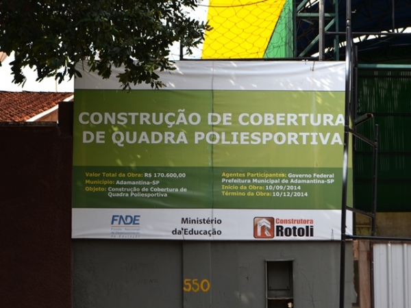 As obras estão sendo executadas por empresa contratada pela Prefeitura de Adamantina, com recursos do FNDE (Fundo Nacional de Desenvolvimento da Educação), do Ministério da Educação, no valor de R$ 170.600,00. O início da obra está identificado na placa como sendo 10 de setembro de 2014, e término 90 dias depois, ou seja, em 10 de dezembro do ano passado.