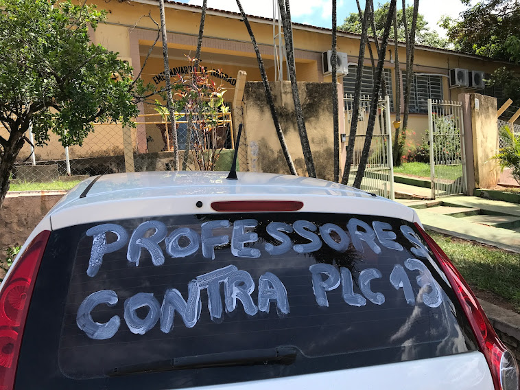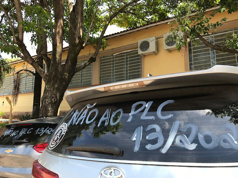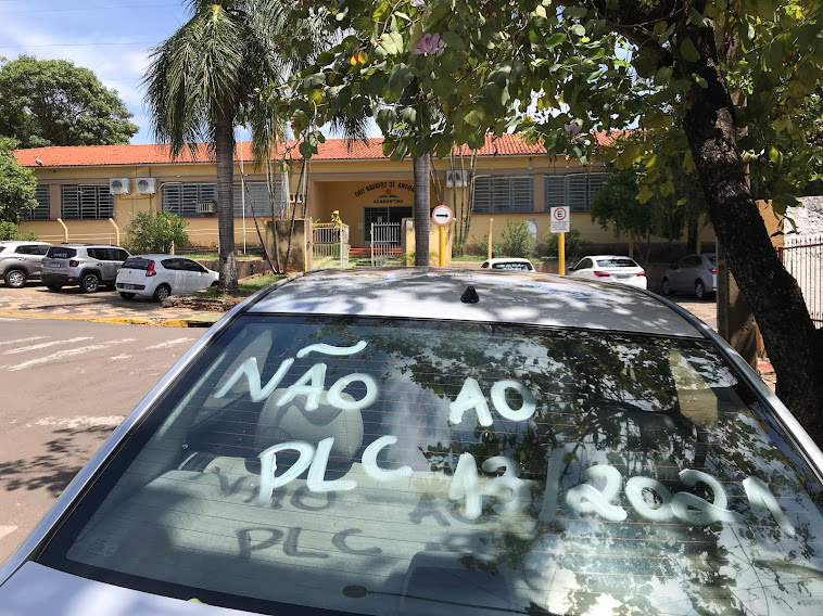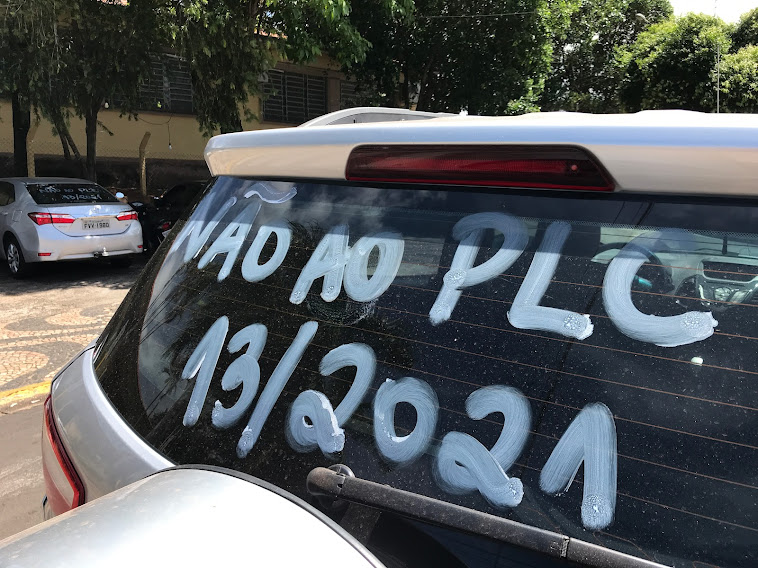 Carros são pintados com mensagens “Não ao PLC 13/2021” e “Professores contra PLC13/2021”.