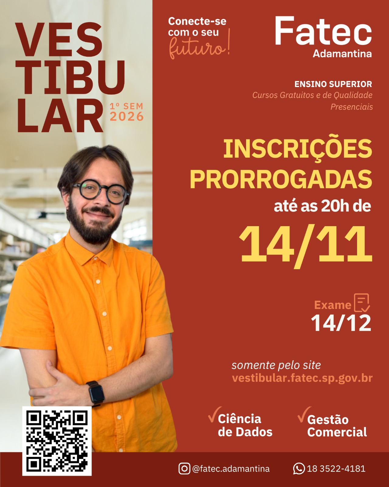 O Centro Paula Souza (CPS) prorrogou o prazo de inscrições para o Vestibular 2026 das Faculdades de Tecnologia (Fatecs). Agora, os interessados em estudar na Fatec Adamantina têm um tempinho extra: as inscrições podem ser feitas até as 20 horas do dia 14 de novembro, próxima sexta-feira, exclusivamente pela internet, no site vestibular.fatec.sp.gov.br. A taxa de inscrição é de R$ 47.