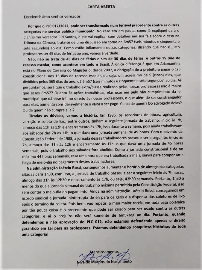 Em uma carta aberta o Sindicato dos Servidores Públicos Municipais de Adamantina, por meio do seu presidente Nivaldo Martins do Nascimento (Londrina), se manifestou sobre o projeto de lei e contextualizou sobre o tema, especificamente, como também acerca de outras demandas do funcionalismo municipal.