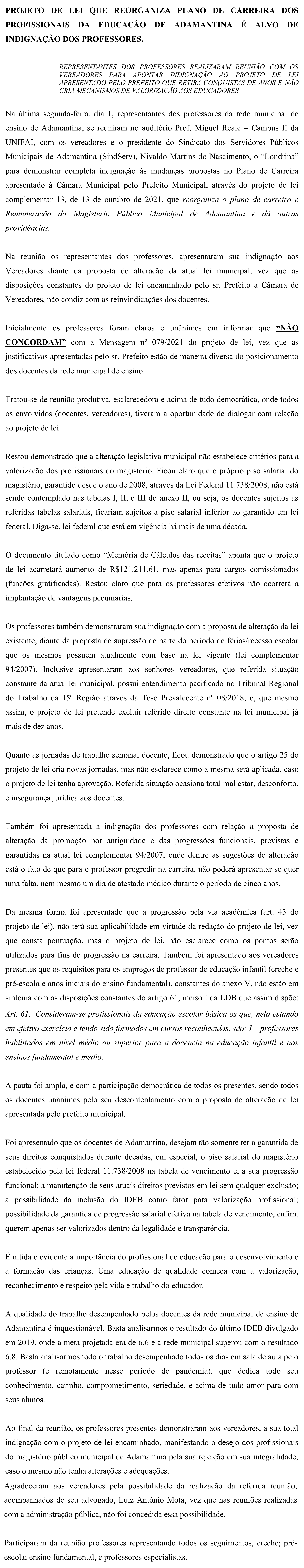 Ao final da reunião os professores participantes demonstraram aos vereadores a sua total indignação com a atual redação do PL da Prefeitura, em trâmite na Câmara Municipal, manifestando o desejo dos profissionais do magistério público municipal de Adamantina pela sua rejeição, caso o mesmo não tenha as alterações e adequações buscadas pela categoria.