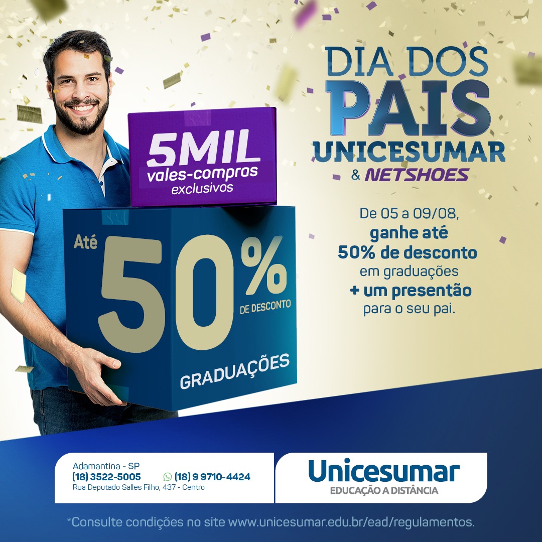 O dia dos pais é neste domingo (9) e, que tal traduzir todo o seu amor e gratidão com conhecimento? Esse pode ser o momento de colocar em prática aquele antigo sonho do seu pai em fazer uma graduação. Para isso, a Universidade Unicesumar está oferecendo bolsas de estudo com 50% para Graduação e Pós-Graduação. Além disso, em parceria com a Netshoes, está concedendo 5 mil vales-compras com descontos exclusivos e acumulativos com outras promoções no site da loja.