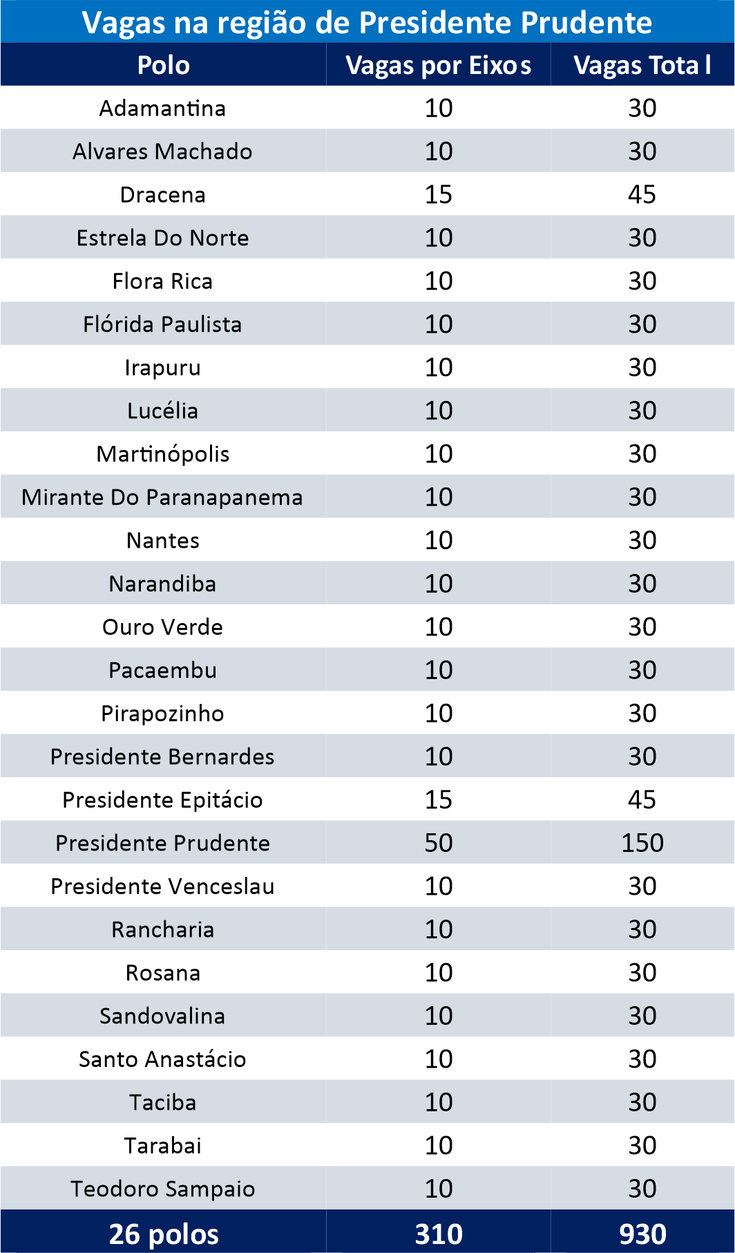 A Universidade Virtual do Estado de São Paulo (Univesp) abriu na segunda-feira (6) as inscrições para 25.350 vagas do vestibular anual 2023, destinadas a 419 polos, de 366 municípios. Na região de Presidente Prudente são 930, voltadas a 26 polos. Em Adamantina, são 30 vagas. Veja o quadro de vagas para a região: