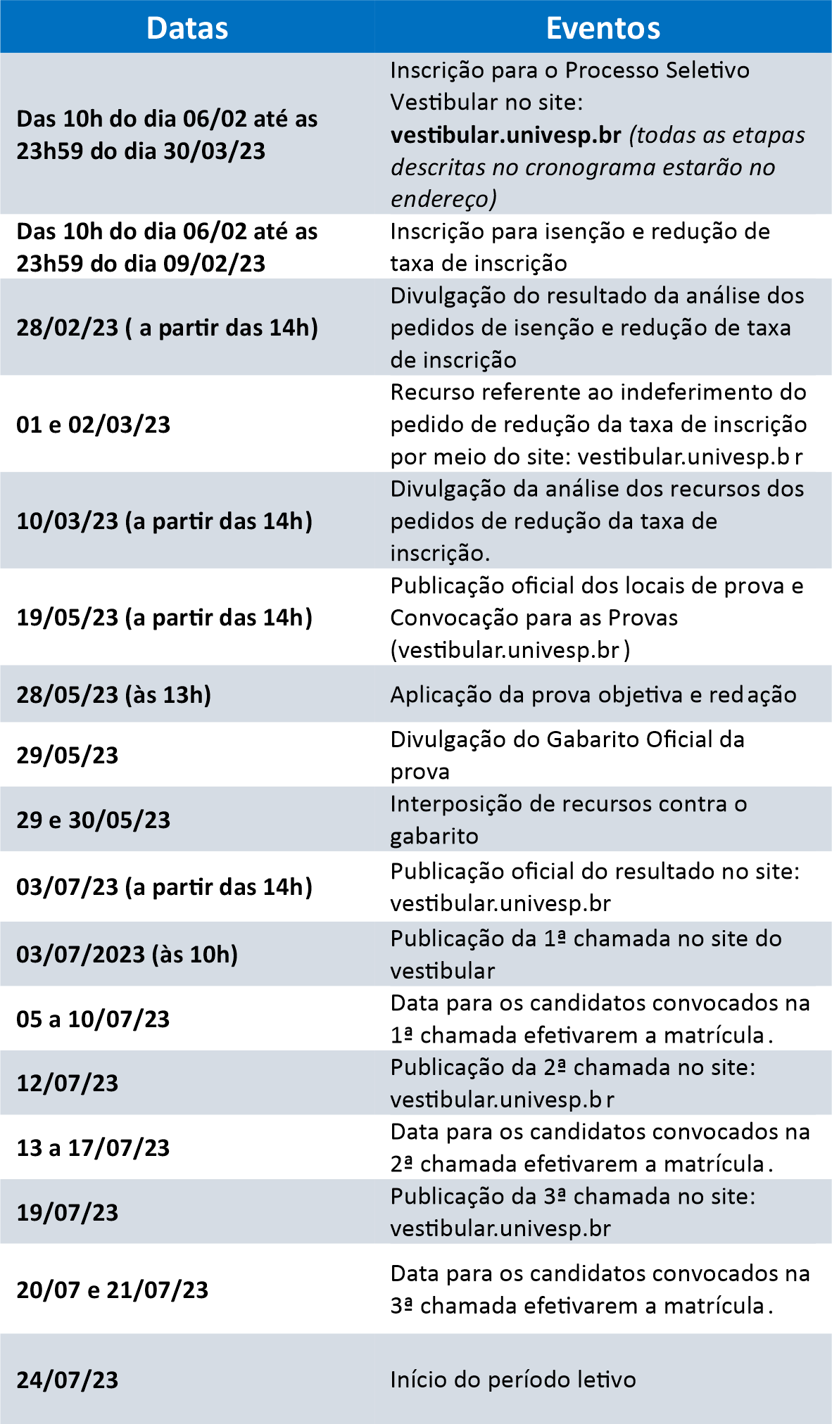 As inscrições terminam no dia 30 de março, às 23h59, e devem ser feitas pelo site vestibular.univesp.br. A prova (objetiva e redação) ocorrerá no dia 28 de maio, às 13h, e os locais oficiais serão divulgados no dia 19 do mesmo mês. O início das aulas está previsto para o final de julho de 2023 (veja abaixo o calendário completo do Vestibular).