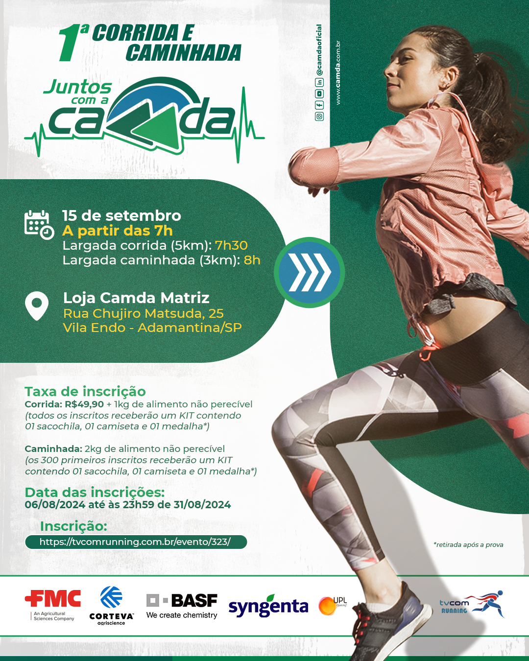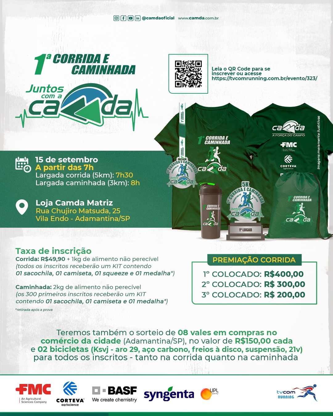 Seguem abertas até este sábado (31) as inscrições para a 1ª Corrida e Caminhada Juntos com a Camda. A iniciativa da cooperativa adamantinense acontece no dia 15 de setembro.