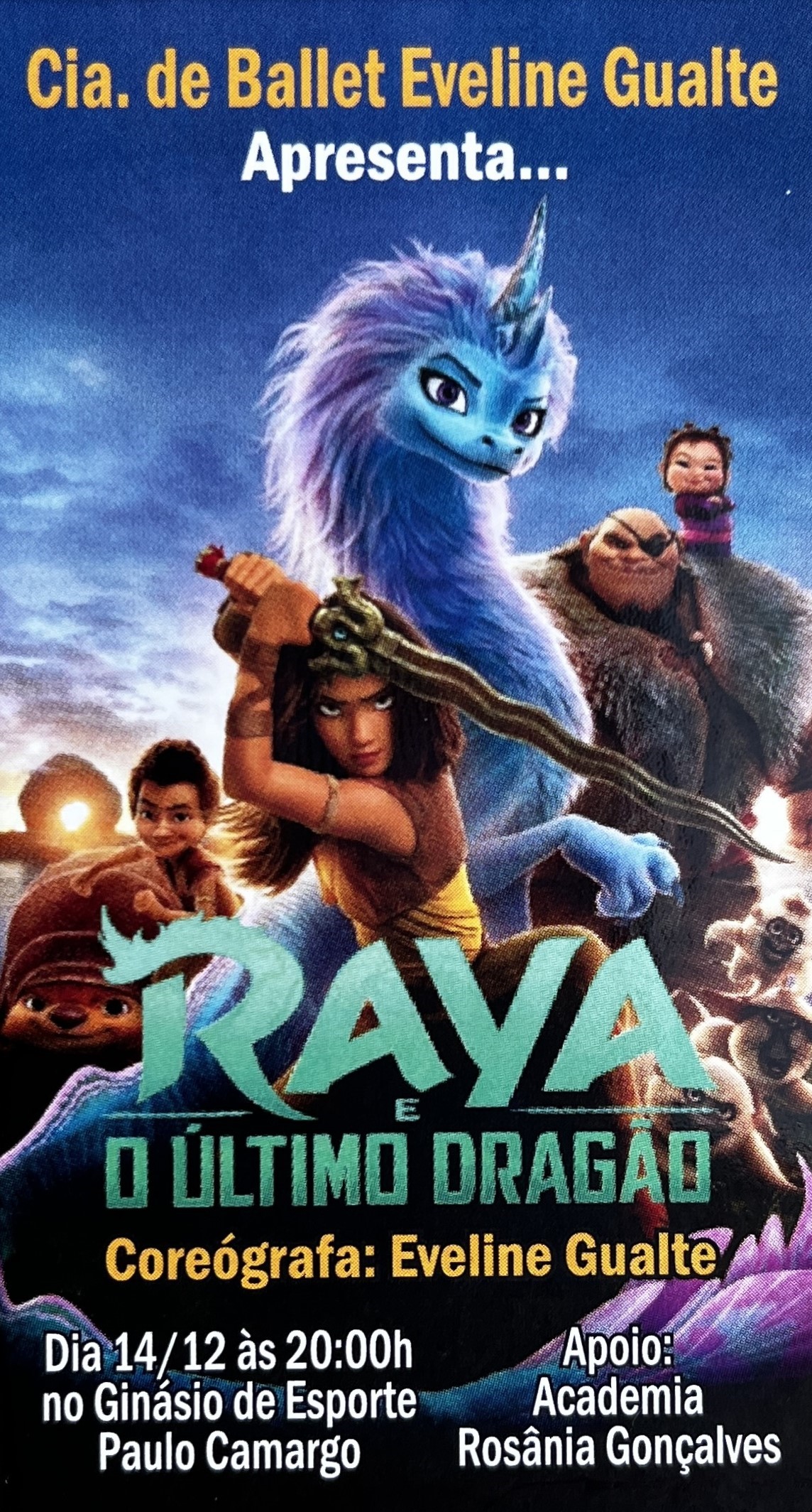 A segunda agenda está prevista para às 20h com o espetáculo Raya e o último Dragão. O original é uma animação da Disney de 2021, e traz coreografias e direção da professora Eveline Gualte.