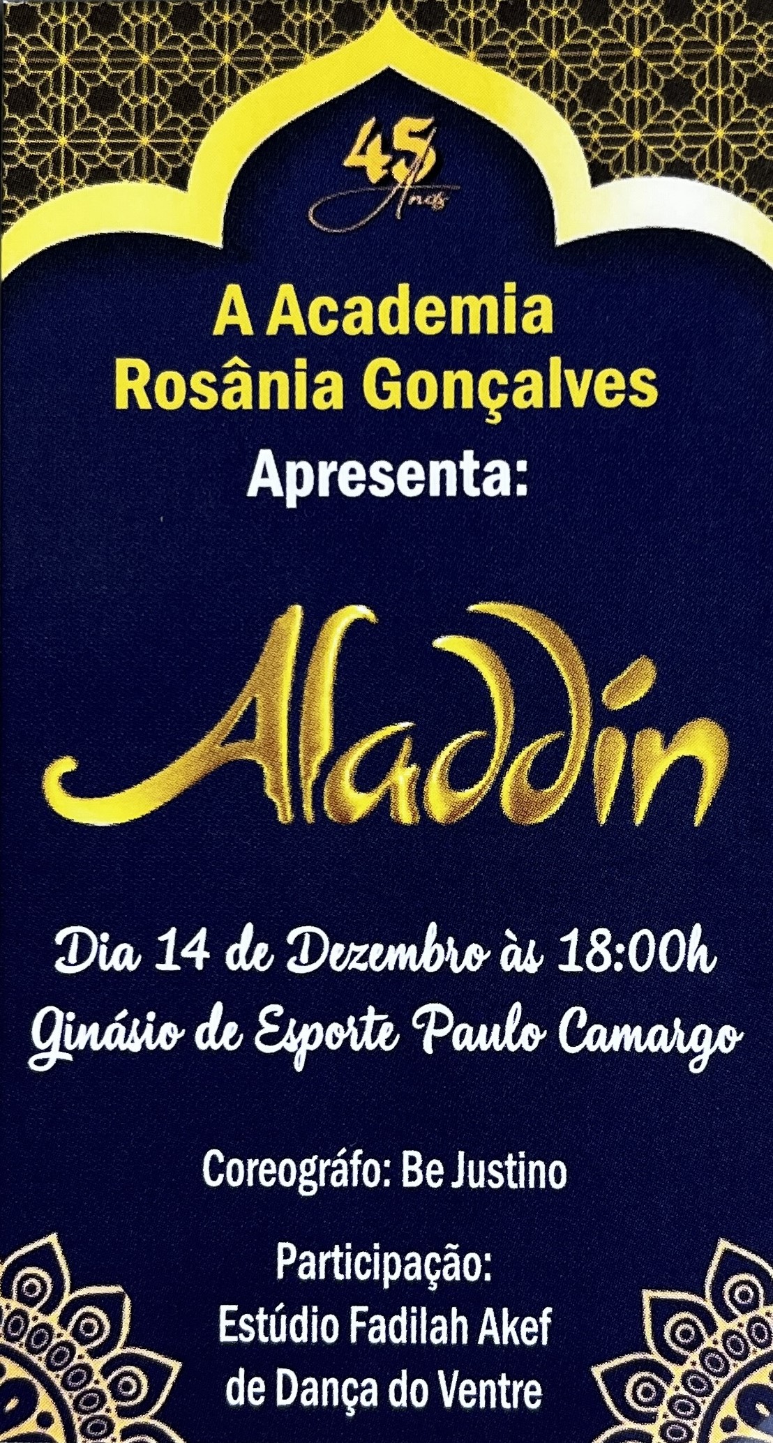 A primeira agenda é às 18h com o espetáculo Aladdin, com a Academia Rosânia Gonçalves, e traz uma adaptação do conto clássico da literatura, que depois ganhou formas no cinema de Walt Disney. O espetáculo tem como coreógrafo o professor Be Justino, e anda participação do Estúdio Fadilah Akef de Dança do Ventre.