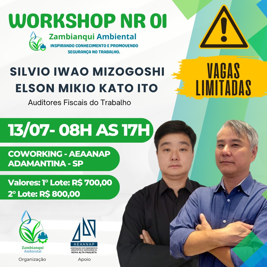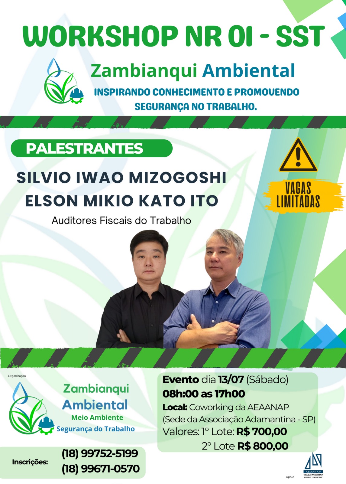 O evento traz como palestrantes os especialistas Silvio Iwao Mizogoshi e Elson Mikio Kato Ito, que são Auditores Fiscais do Trabalho, e se relacionam diariamente com o tema. Na programação os participantes terão a oportunidade de atualizar seus conhecimentos, trocar experiências e discutir as melhores práticas para a implementação efetiva das diretrizes da NR-1.