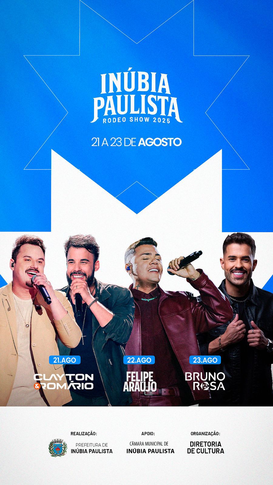 Fernando Rossi reforça o convite para a participação do público. “O Inúbia Paulista Rodeo Show 2025 foi pensado com muito carinho e responsabilidade para celebrar com nossos moradores o aniversário da nossa cidade, que diariamente recebe visitantes de toda a região”, disse. “Nestes dias nossa cidade fará essa recepção especial e festiva, com o rodeio de qualidade e shows de renome nacional”, comemora o prefeito.