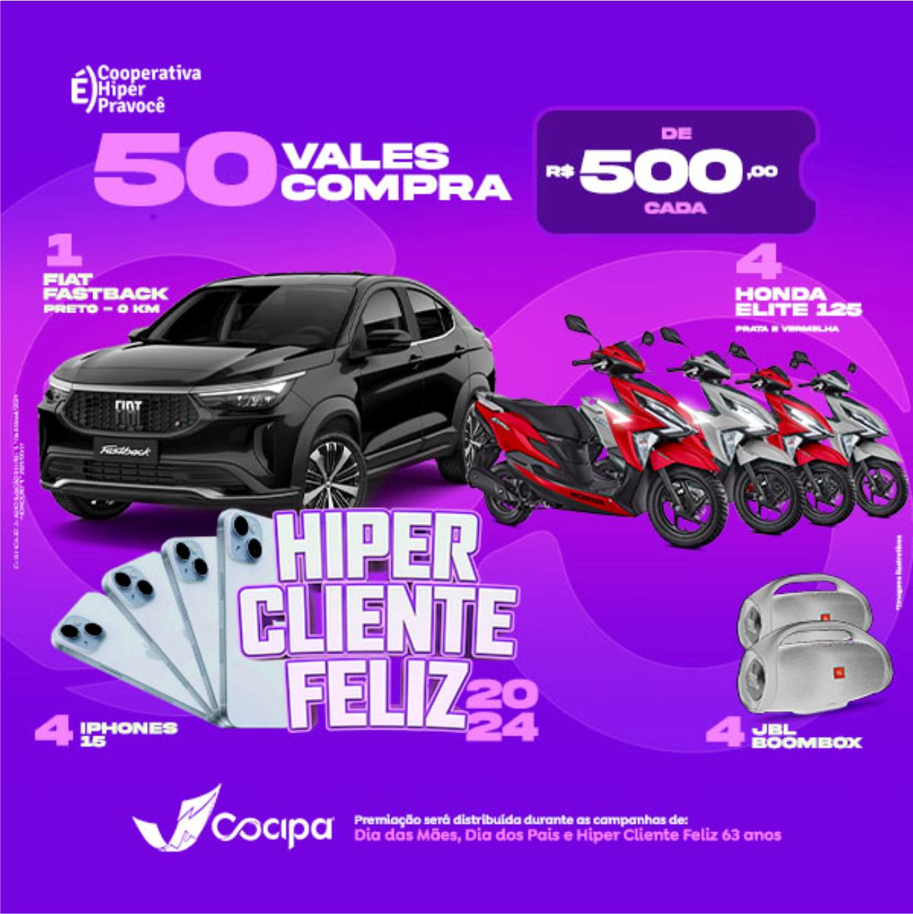 Com um novo formato e mais robusta, a Cocipa (Cooperativa de Consumo de Inúbia Paulista) iniciou nesta segunda-feira (1) a Campanha Hiper Cliente Feliz 63 anos. Até o fim do ano, em três etapas, o cooperado participante concorre a um automóvel Fiat Fastback, quatro motos Honda Elite 125, quatro Iphones 15 128G, quatro caixas de som JBL Boombox e 50 vales compra de R$ 500. Os 63 prêmios, alusivos aos 63 anos da Cooperativa, somam R$ 225.892,28.