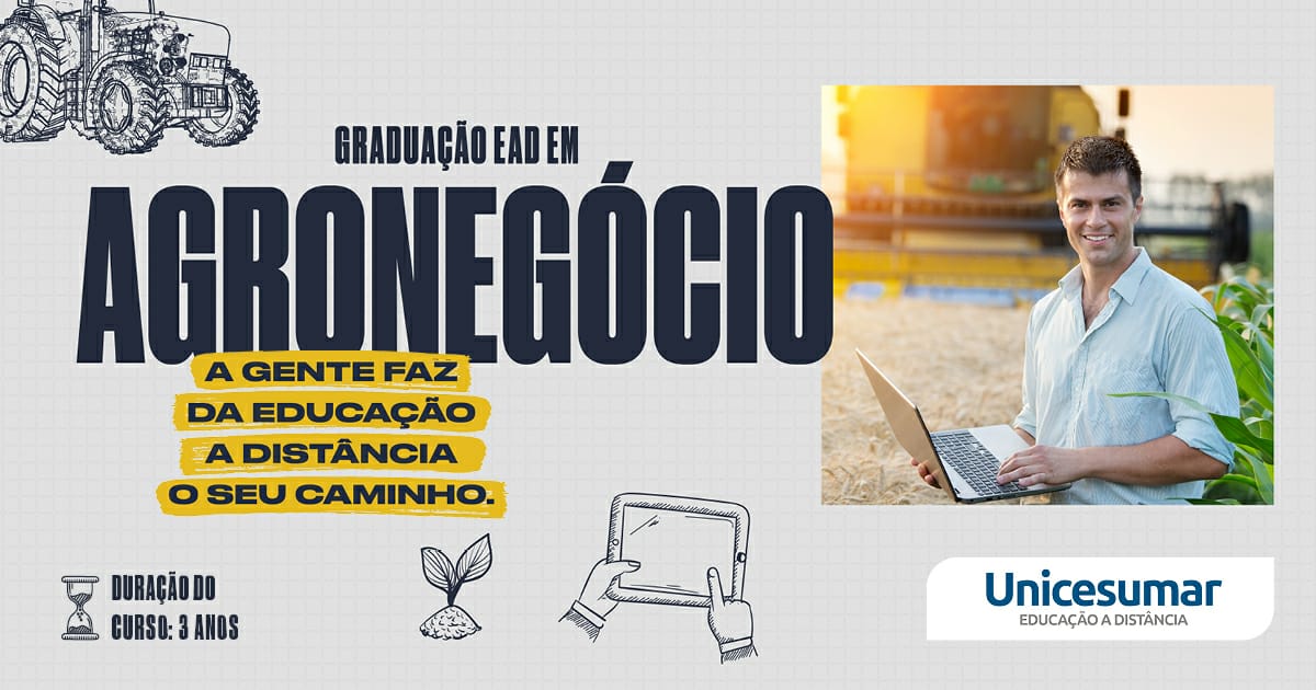 No curso de Agronegócio a distância da EAD Unicesumar, você será preparado para viabilizar soluções tecnológicas e competitivas para o desenvolvimento de negócios agropecuários a partir do domínio dos processos de gestão em cadeias produtivas do setor. Além disso, estará apto a prospectar novos mercados, fazer a análise de viabilidade econômica, identificar alternativas de captação de recursos, beneficiamento, logística e comercialização de produtos agroalimentares, dentre outras atribuições.