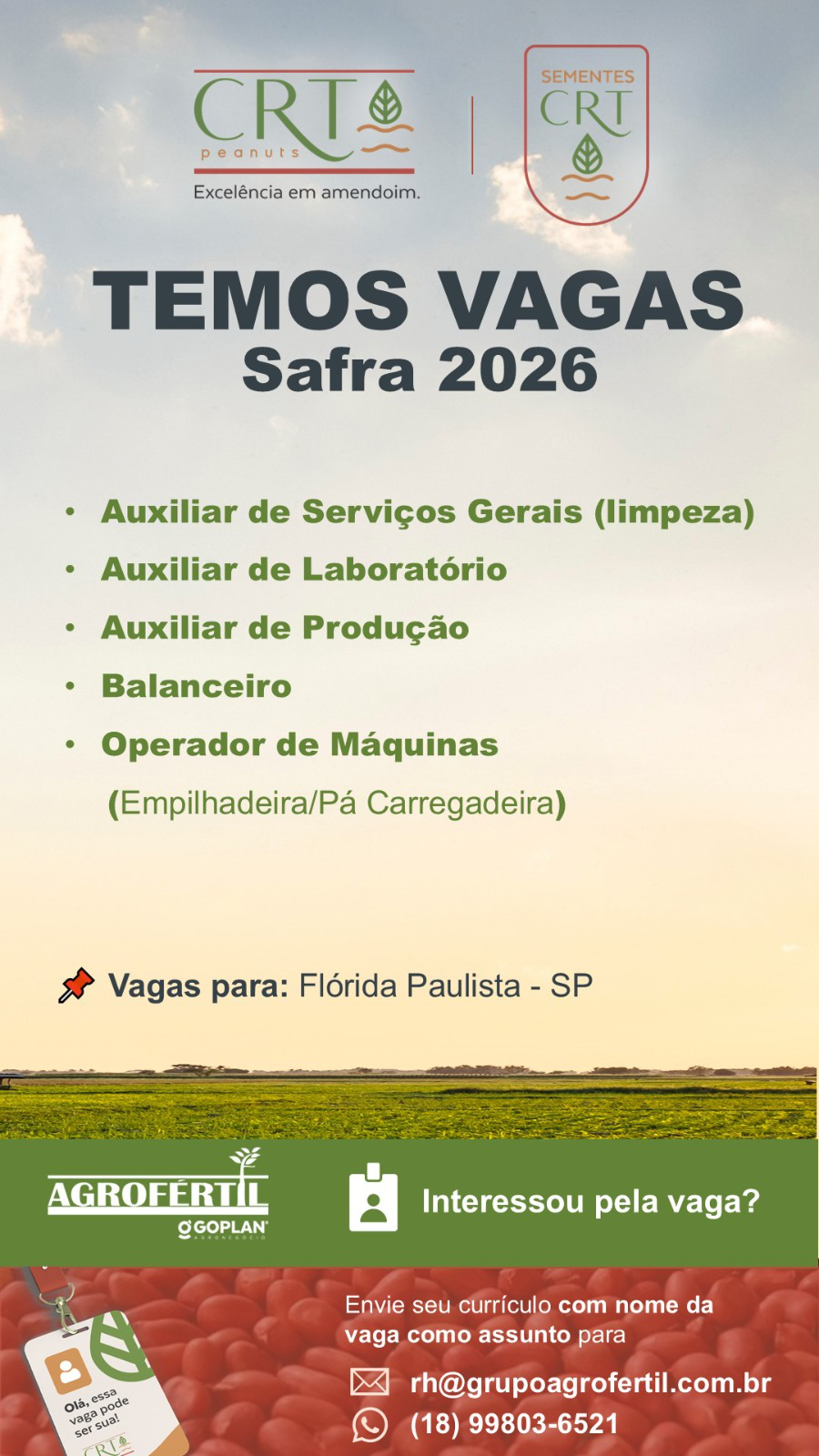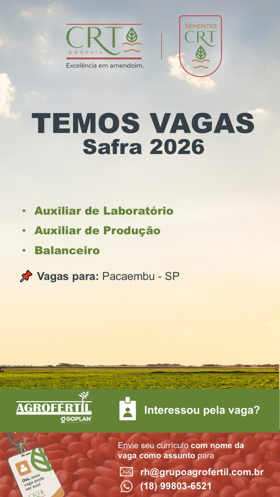 A CRT Peanuts, empresa do Grupo CRIALT – Agrofértil, marca sua chegada ao Ano Novo com abertura de vagas de trabalho para a safra 2026. As oportunidades abrangem funções operacionais e técnicas, com postos disponíveis nas cidades de Flórida Paulista e Pacaembu.