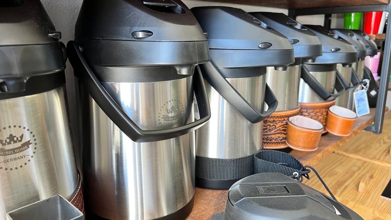 No espaço é possível encontrar garrafas térmicas em diferentes capacidades – de 1,3L a 5L – como também em diferentes acabamentos, em inox, couro com modelagem artesanal, temáticas (Copa do Mundo, times de futebol, personagens etc) e adesivadas.