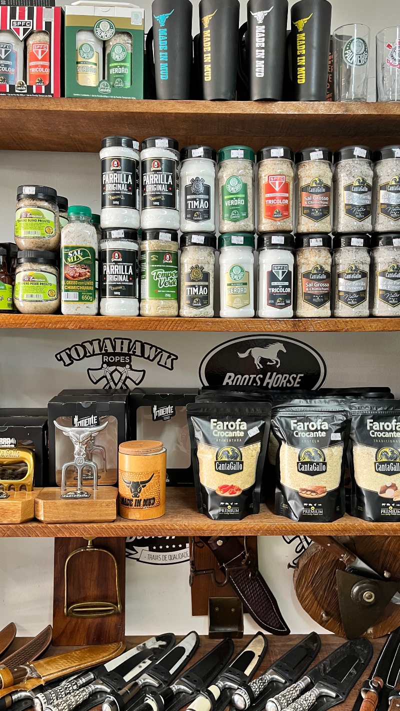Ainda na loja, o cliente tem acesso a uma seção de artigos para churrasco, como sal, temperos, molhos, farofas, tábuas, facas, canivete e acessórios de corte para manuseio de assados, como as “garras de urso” e tridentes.
