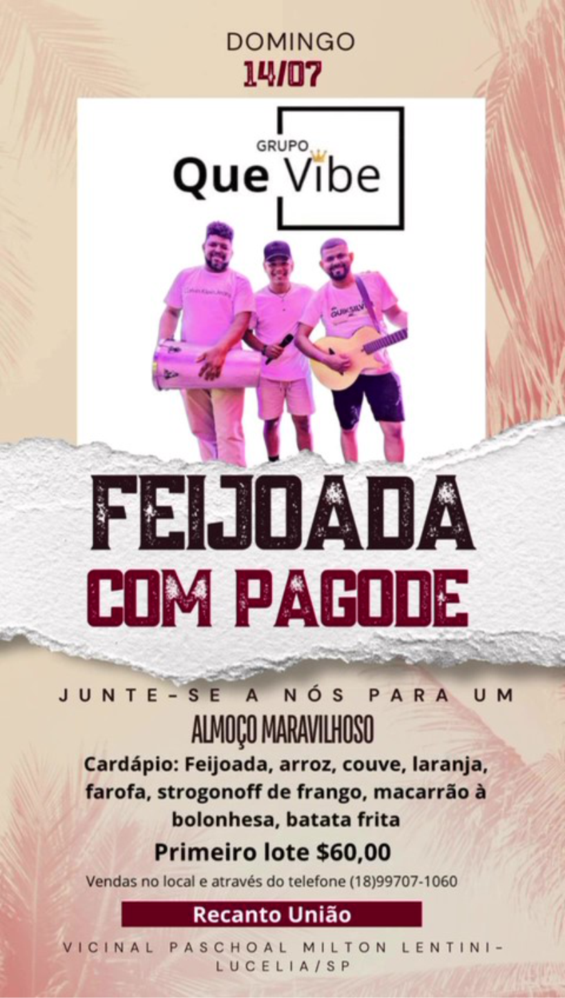 O Recanto União Petiscaria e Restaurante, no bairro União, em Lucélia, promove neste domingo (14) mais uma agenda especial no seu almoço: “Feijoada com Pagode”. A programação promete atrair o público da região para um almoço com cardápio feijoada completa e música ao vivo com o Grupo Que Vibe.