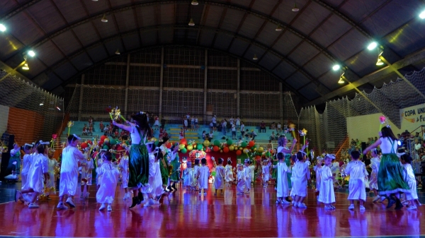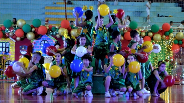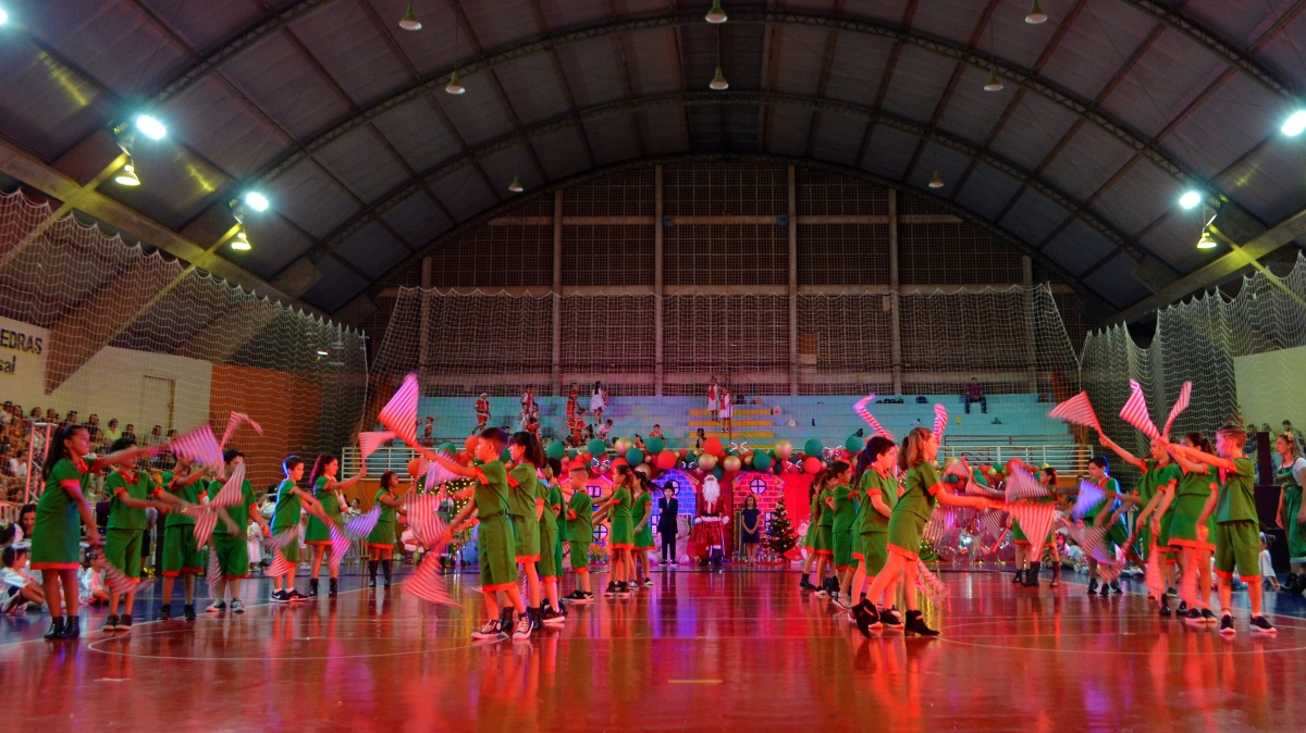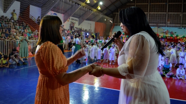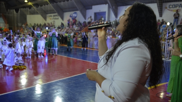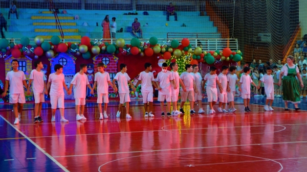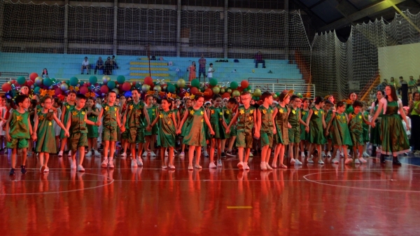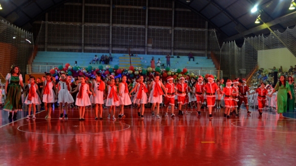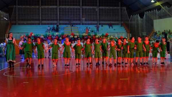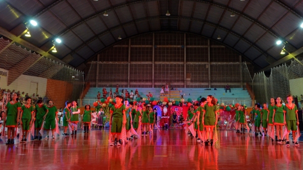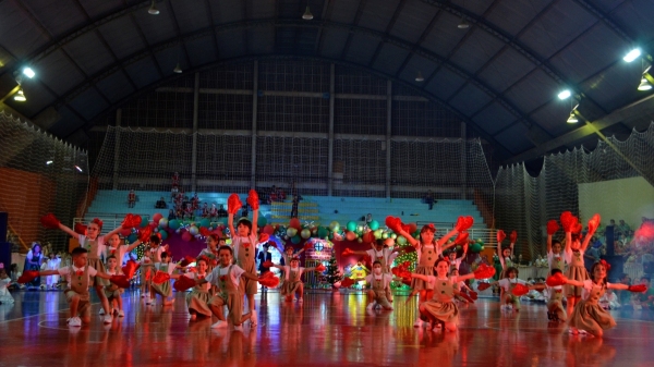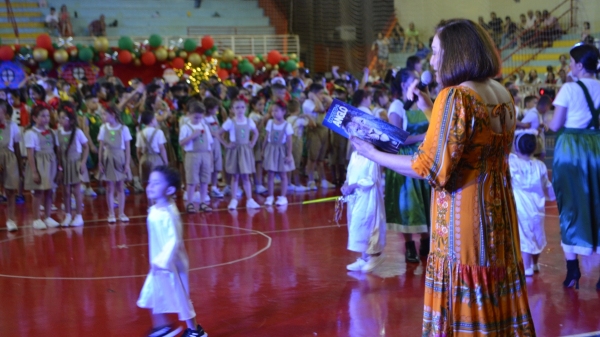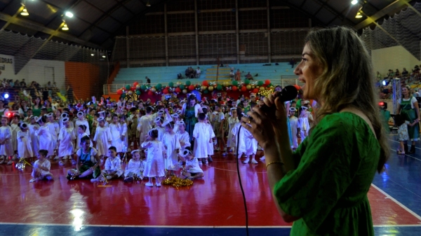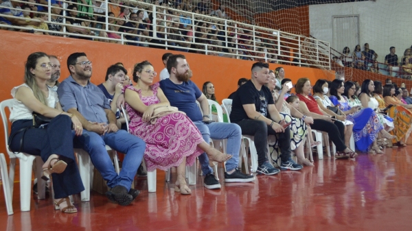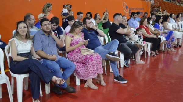 O público, formado sobretudo por pais e familiares dos alunos da educação infantil e ensino fundamental, lotou o Ginásio de Esportes e aplaudiu a apresentação das crianças.