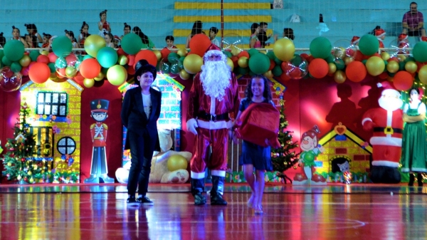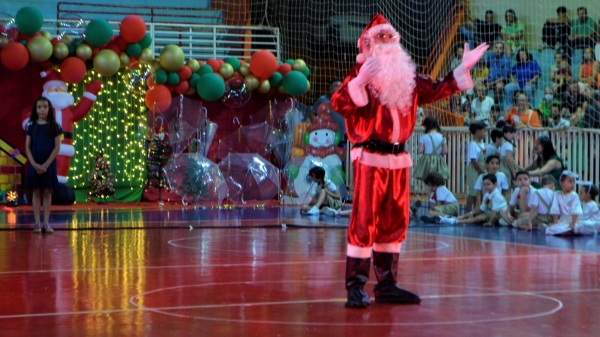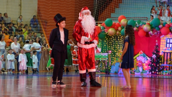 Em todo o espetáculo dois alunos ancoraram o roteiro, dialogando sobre o Natal. Em torno das falas das duas crianças ocorriam as cenas, iniciadas com a participação das crianças menores, da educação infantil, evoluindo até alcançar as turmas do ensino fundamental 1. O Papai Noel também apareceu, consolidando as expectativas dessa época festiva.