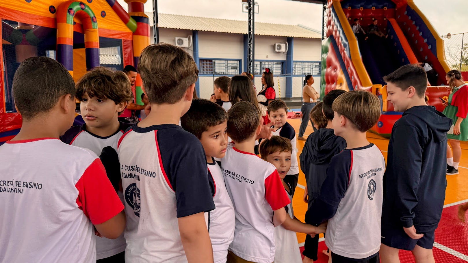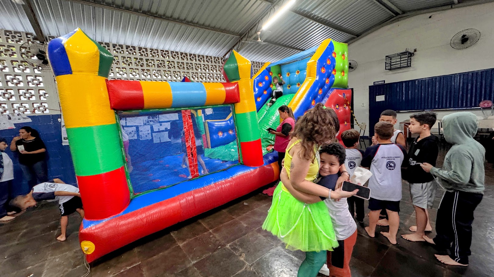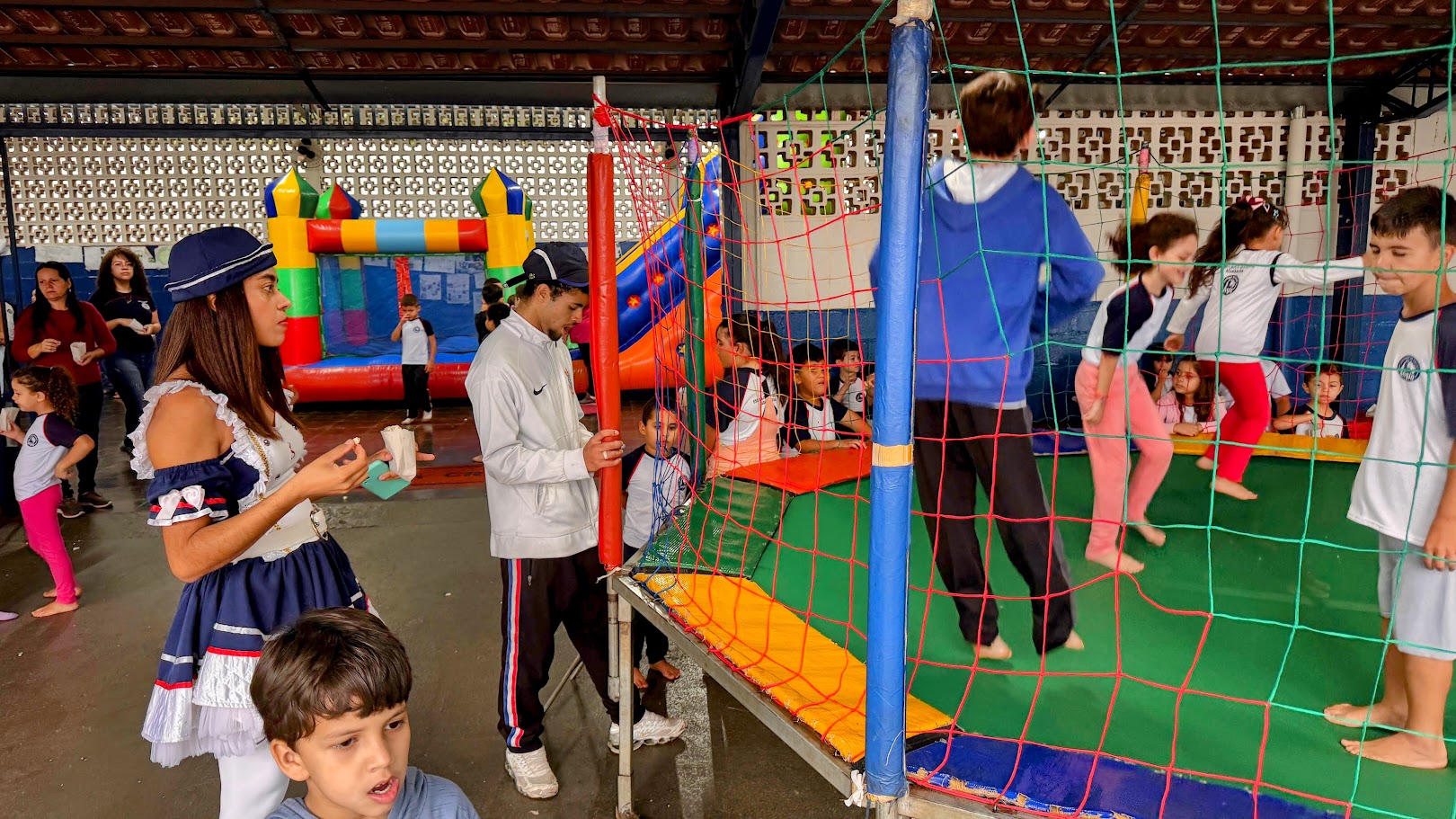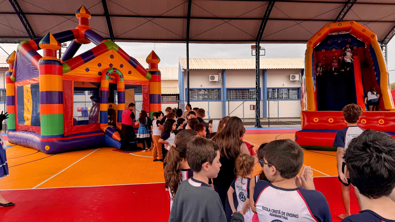 O tempo chuvoso de segunda-feira não comprometeu a atividade da Escola. Parte dos infláveis foi montada na quadra coberta, que no recesso escolar de julho recebeu um novo piso modular em polipropileno. O novo piso possui pequenas aberturas que facilitam o escoamento da água, evitando acúmulos e garantindo que a quadra esteja sempre pronta para uso, independentemente das condições climáticas ou da necessidade de limpeza. A medida previne, principalmente, interrupções causadas pela chuva, já que o espaço, embora coberto, pode receber incidência de água pelas laterais.