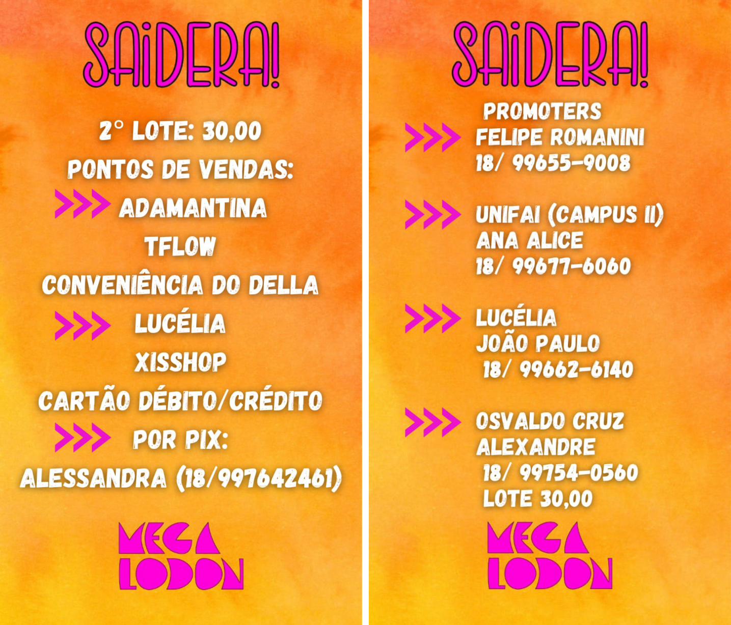 Com Saidera!, o Hangar é o endereço certo para se divertir neste fim de semana. Os convites estão à venda em pontos credenciados em Adamantina e Lucélia, e com promoters nas duas cidades e Osvaldo Cruz.