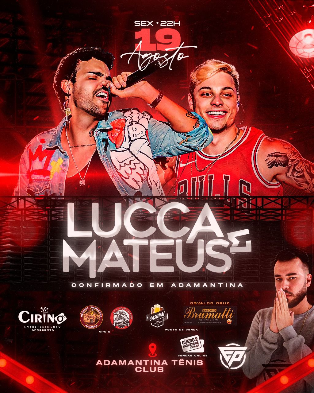 A dupla Lucca e Mateus, que busca fazer música sem rótulos, misturando o sertanejo com ritmos como funk, trap, pagode e outros, emplacando grandes sucessos nas paradas nacionais, faz show no Adamantina Tênis Clube (ATC) no dia 19 de agosto. A atração vem à cidade com produção assinada pela Cirino Entretenimento, empresa que atua há 16 anos com eventos, em Marília.