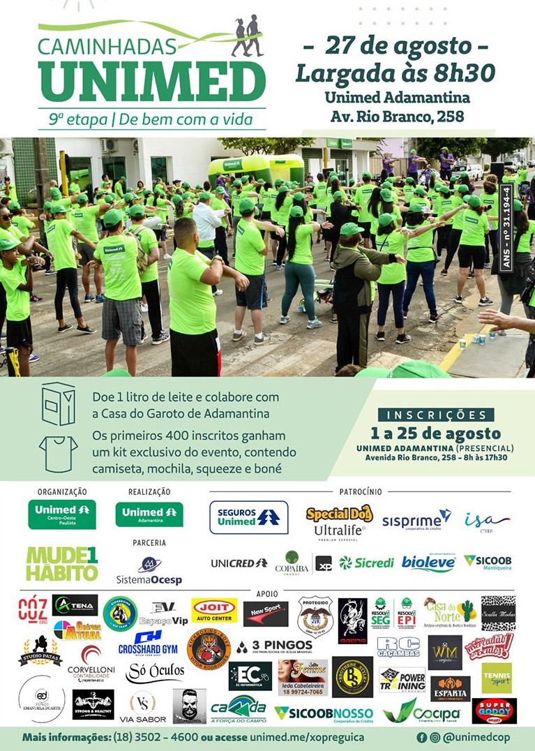 A Caminhada Regional Unimed De Bem com a Vida é uma realização conjunta de Unimed Centro Oeste Paulista com 11 singulares da cooperativa médica, de Adamantina, Assis, Bauru, Botucatu, Dracena, Jaú, Lençóis Paulista, Lins, Marília, Ourinhos e Tupã, e preza pelo legado de levar qualidade de vida e bem-estar à população.