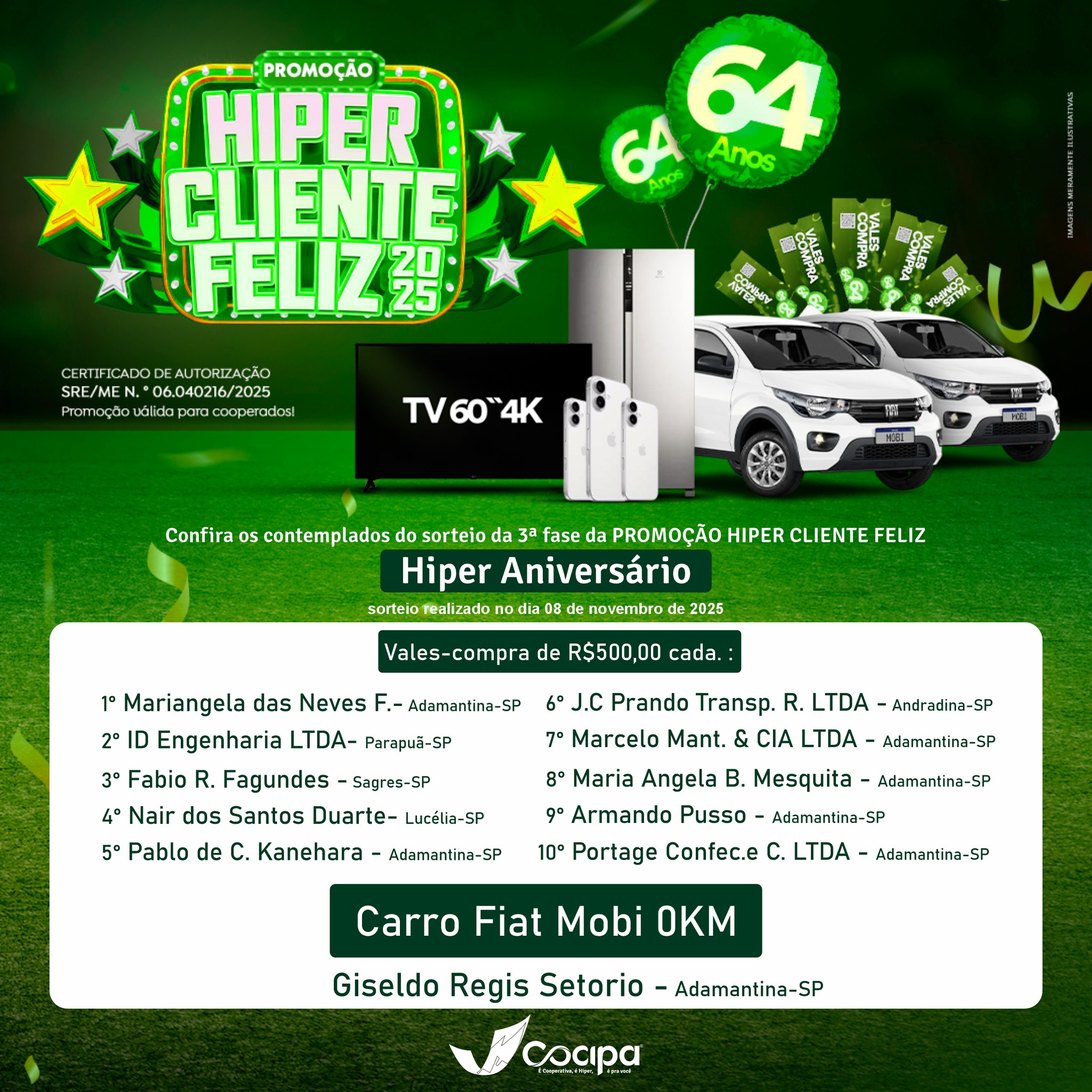 Todos os sorteios ocorrem na loja Hiper Cocipa em Inúbia Paulista, sempre às 10h, abertos ao público e com transmissão ao vivo pelos seus canais de redes sociais. Acesse aqui o regulamento completo da campanha.
