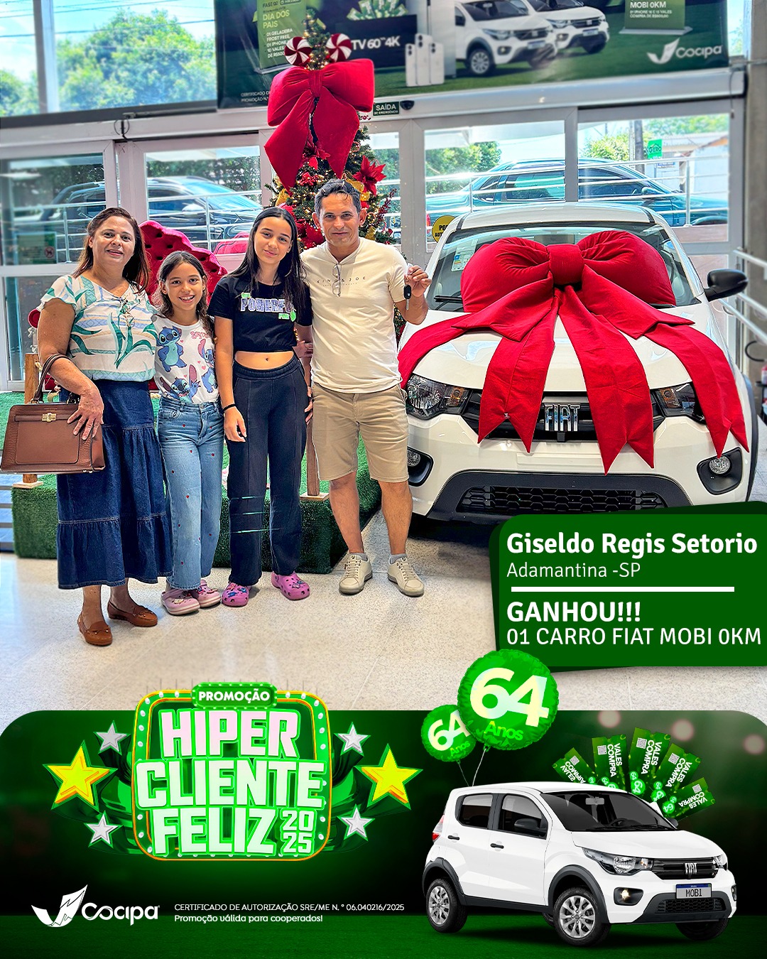 O caldeireiro Giseldo Regis Setorio, morador na Vila Industrial, em Adamantina, recebeu neste sábado (22) as chaves do automóvel Fiat Mobi zero quilômetro, conquistado no terceiro sorteio da Campanha Hiper Cliente Feliz, da Cocipa (Cooperativa de Consumo de Inúbia Paulista). O sorteio foi realizado no dia 8 de novembro, em Inúbia Paulista, em comemoração aos 64 anos da Cooperativa. A entrega das chaves foi feita pelo gerente comercial da Cocipa, Márcio Cavalaro.