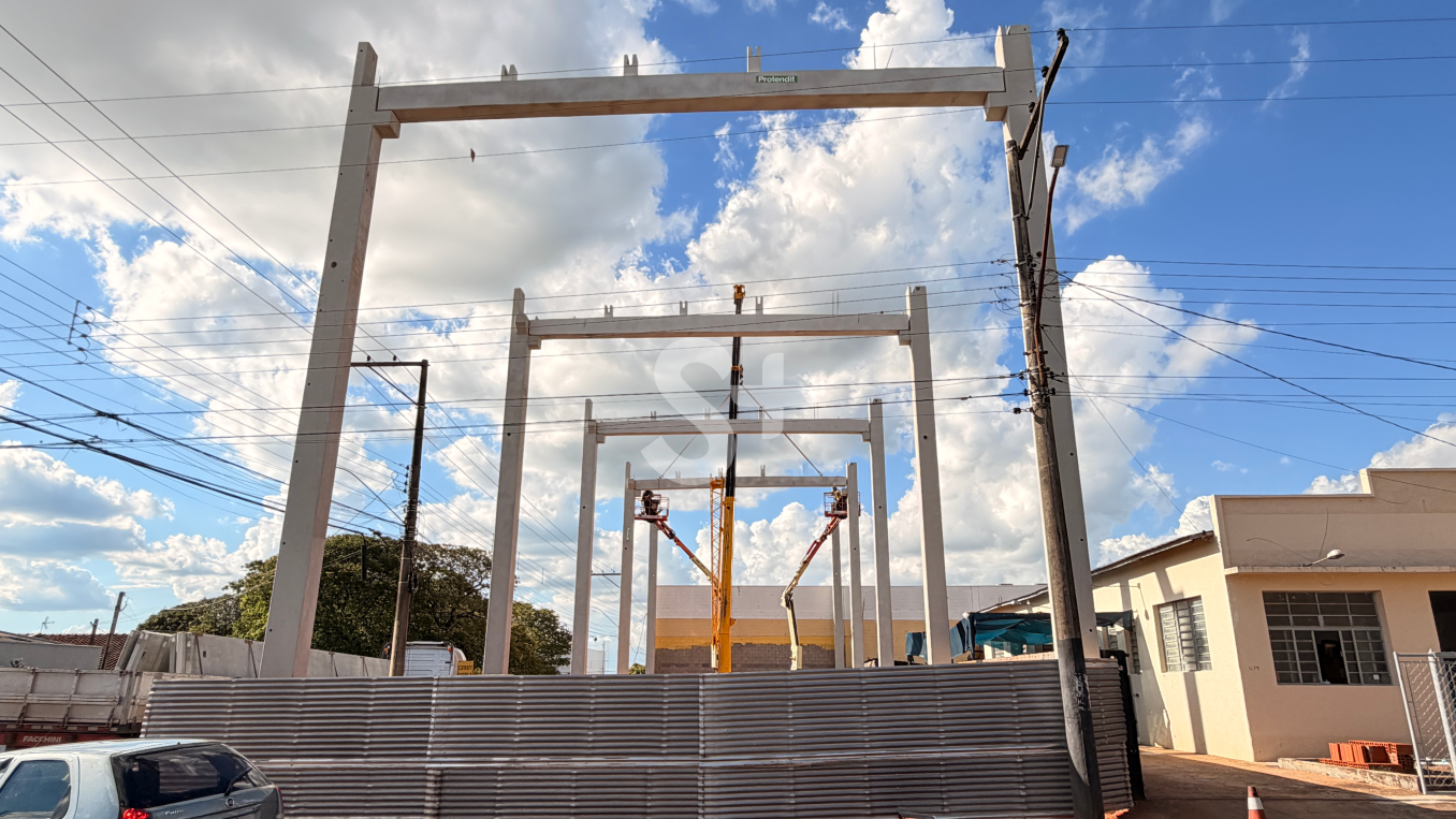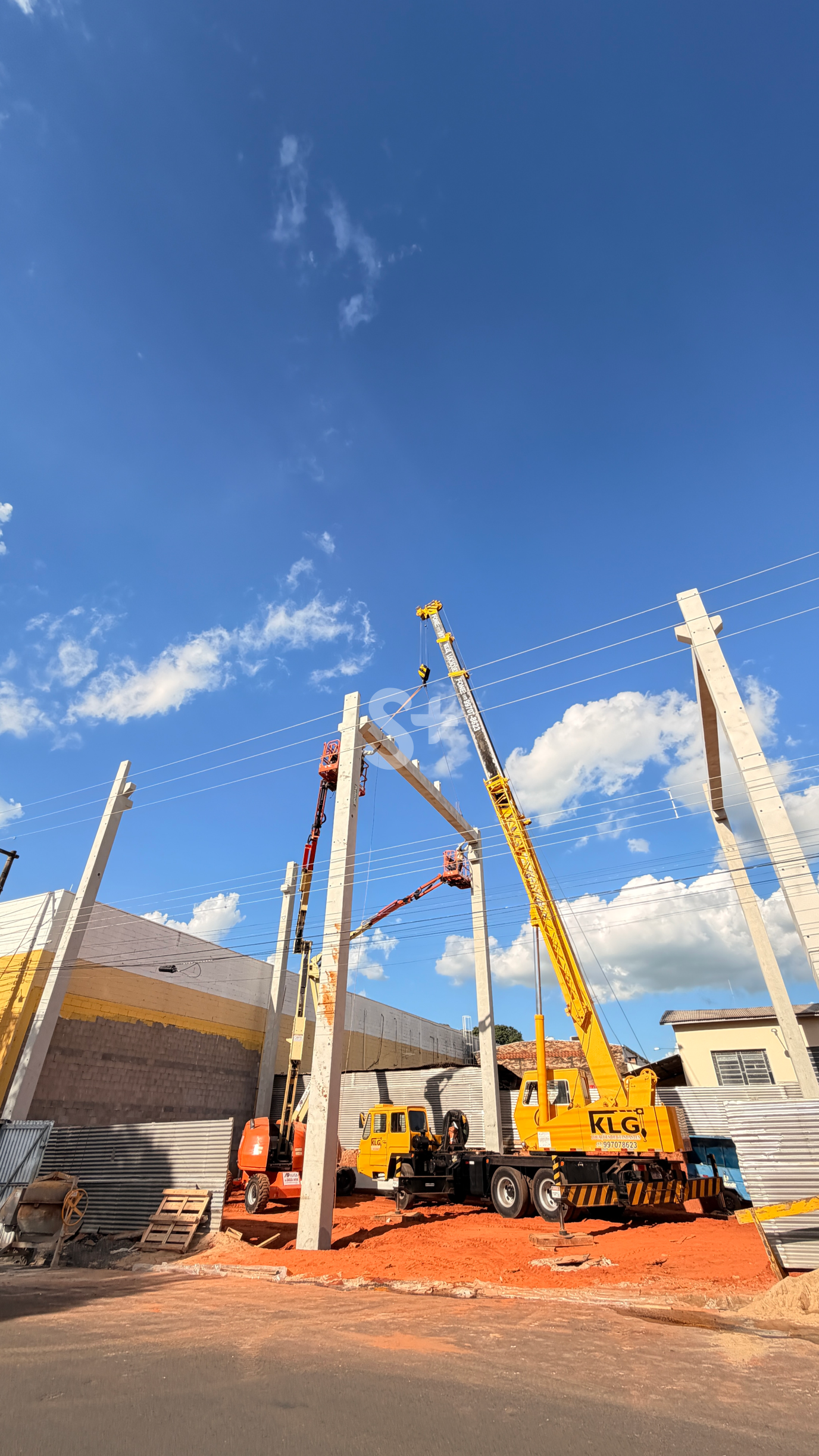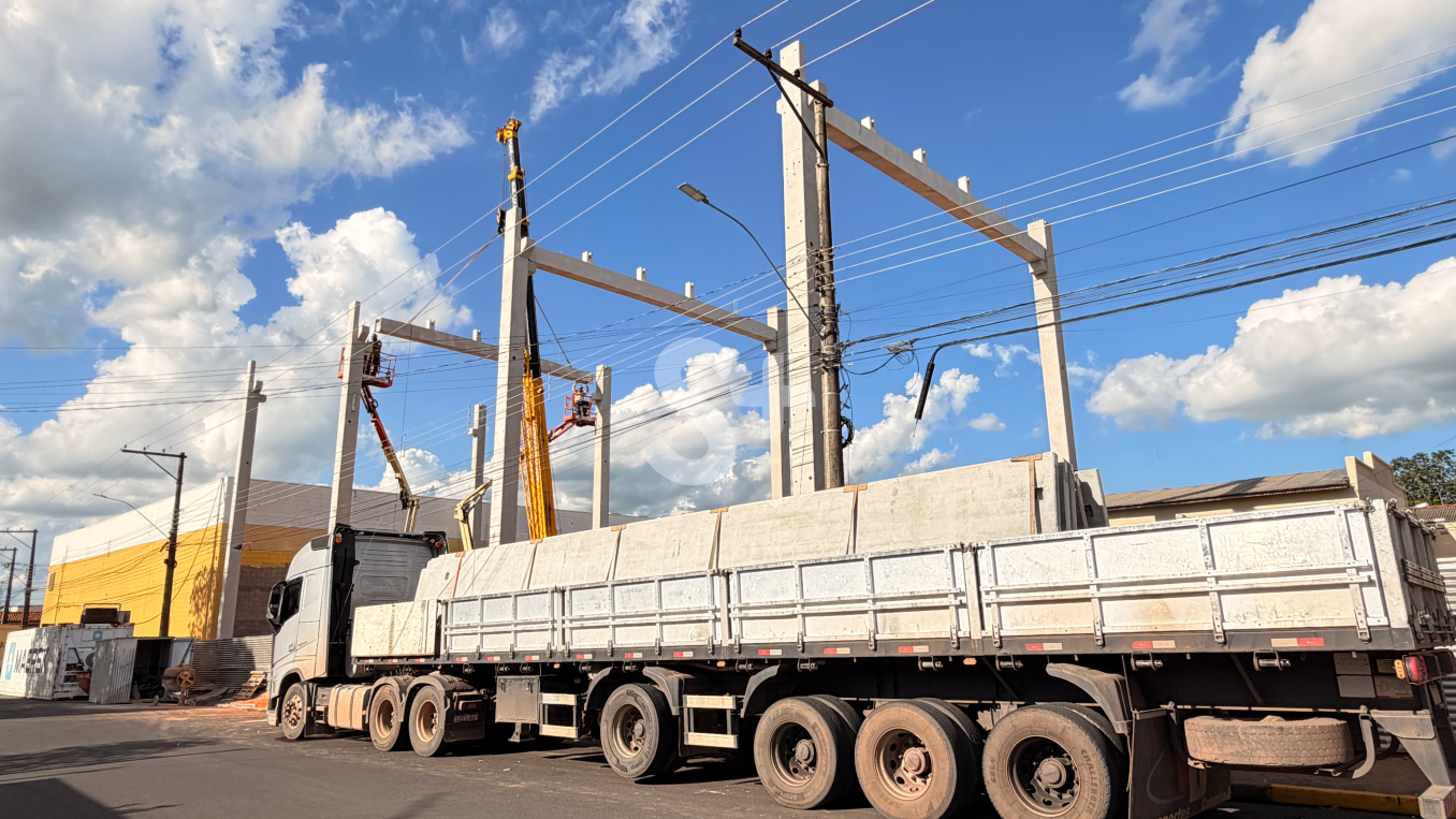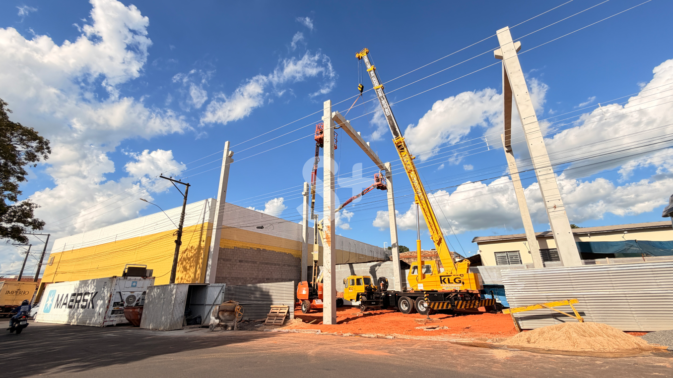 As obras utilizam sistema de concreto pré-moldado e, em poucos dias, passaram a modificar de forma significativa a paisagem no entorno da unidade. A execução mobiliza equipes de trabalhadores, guindaste e equipamentos de apoio, evidenciando o porte do investimento. O novo galpão terá 504 metros quadrados e pé direito com 12 metros de altura, projetado para armazenagem verticalizada, com operação por meio de empilhadeiras, ampliando a eficiência logística da rede.