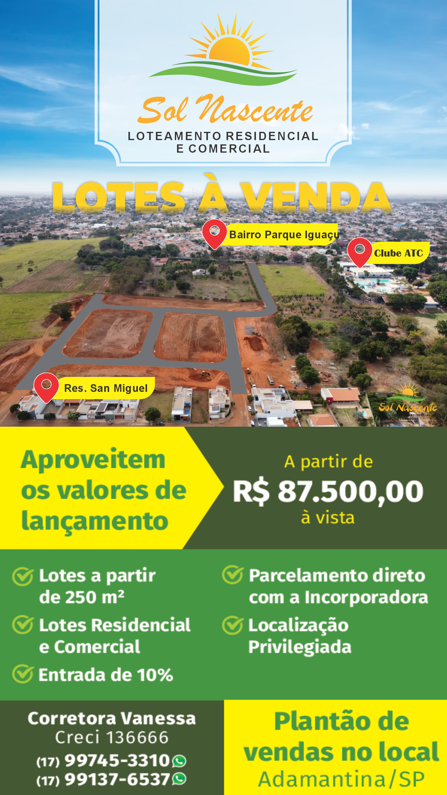 O loteamento Sol Nascente tem plantão de vendas no local. Para mais informações, são dois canais de atendimento por telefone e WhatsApp: (17) 99745-3310 e (17) 99137-6537.