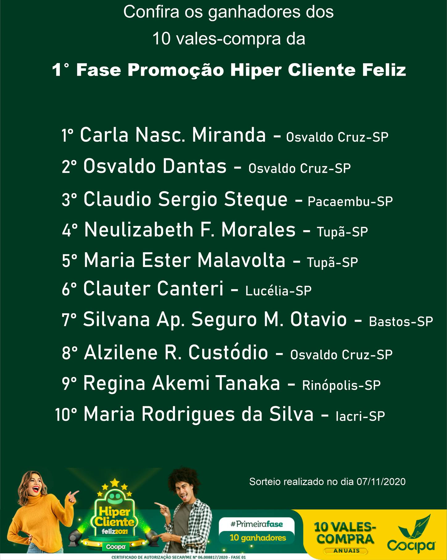 Os contemplados desta primeira fase da campanha são: 1º - Carla Nasc. Miranda (Osvaldo Cruz-SP); 2º - Osvaldo Dantas (Osvaldo Cruz-SP); 3º - Cláudio Sergio Steque (Pacaembu-SP); 4º - Neulizabeth F. Morales (Tupã-SP); 5º - Maria Ester Malavolta (Tupã-SP); 6º - Clauter Canteri (Lucélia-SP); 7º - Silvana Ap. Seguro M. Otávio (Bastos-SP); 8º - Alzilene R. Custódio (Osvaldo Cruz-SP); 9º - Regina Akemi Tanaka (Rinópolis-SP); e 10º - Maria Rodrigues da Silva (Iacri-SP).