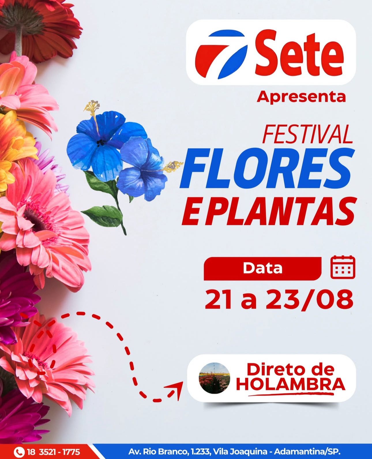 O Supermercado Sete traz para Adamantina uma nova edição do Festival de Flores e Plantas, que começou nesta quinta-feira (21) e segue até sábado (23) na área do estacionamento da loja. Durante esses dias, os clientes poderão encontrar uma ampla variedade de flores e plantas ornamentais vindas diretamente de Holambra, referência nacional na produção de flores.