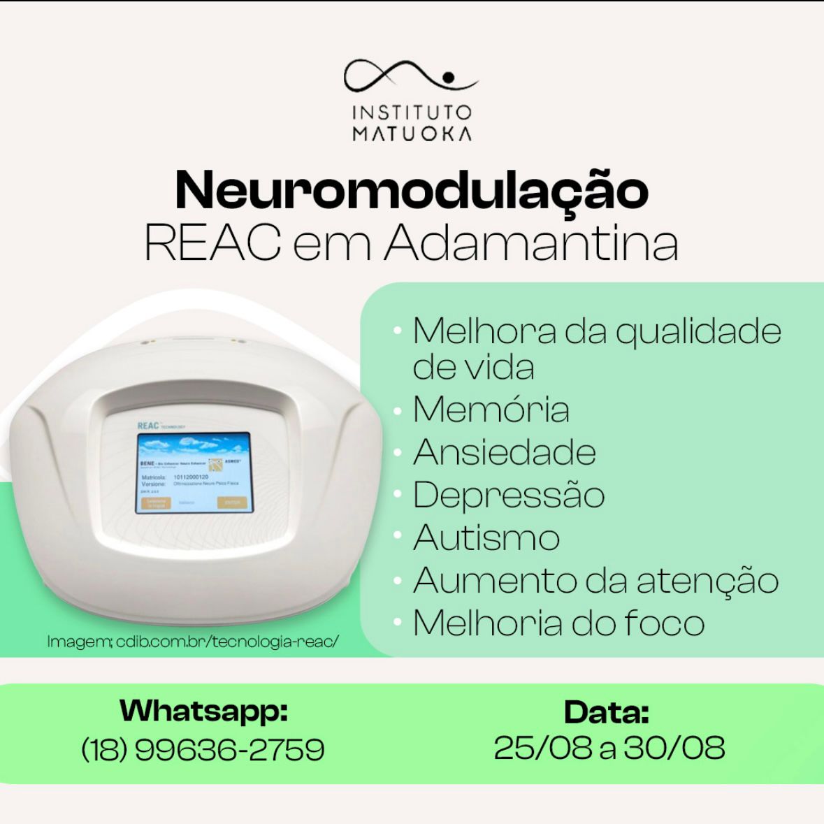 A próxima agenda da terapia REAC em Adamantina será de 25 a 30 de agosto. Para um ciclo de atendimento o protocolo prevê 19 sessões. Por isso é importante o agendamento prévio. O atendimento é realizado no Instituto de Cardiologia, que fica na Rua Vitório Romanini, 61. Para mais informações e agendamento o contato é (18) 99636-2759.