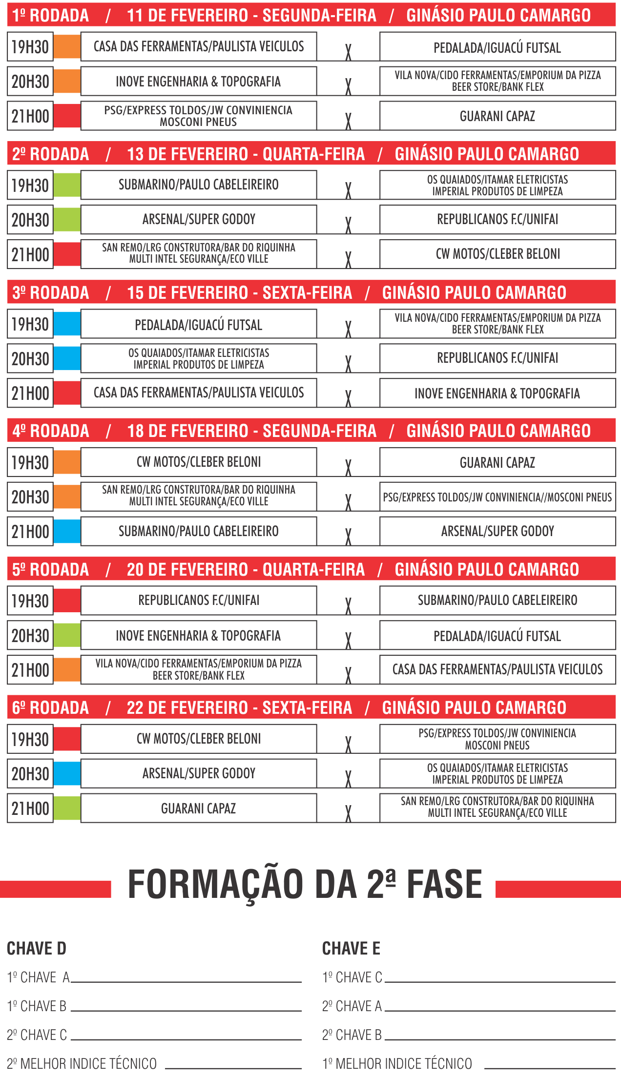 A rodada de abertura terá a equipe campeã do ano passado Casa das Ferramentas/Paulista Veículos diante da equipe do Pedalada Futsal/Parque Iguaçu, às 20h30 a equipe do Inove Engenharia & Topografia enfrenta Vila Nova/Cido Ferramentas/Emporium da Pizza/Beer Store/Bank Flex, às 21h a equipe do PSG/Express Toldos/JW Conveniência/Mosconi Pneus enfrenta o Guarani Capaz. (Continua após a publicidade...)