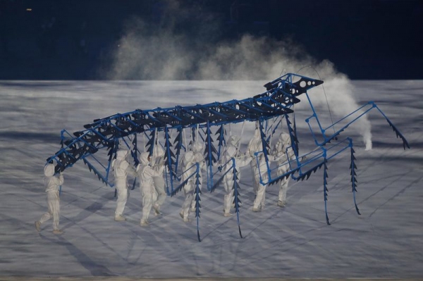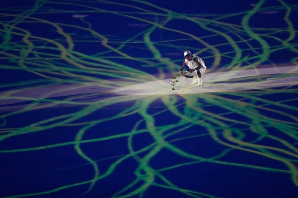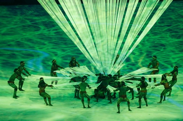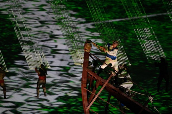 Logo depois, a cerimônia voltou no tempo, ao nascimento das imensas florestas que cobriam o Brasil na chegada dos portugueses. Do começo da vida, a homenagem avança até a formação dos povos indígenas, cuja entrada foi representada por 72 dançarinos das duas grandes agremiações do Festival de Parintins, os Bois Caprichoso e Garantido.
