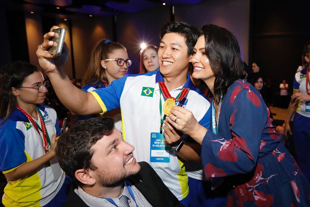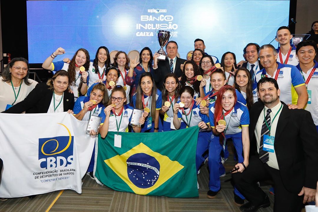 Em Brasília, o grupo de surdoatletas e a equipe técnica que obtiveram o título de campeões do Campeonato Mundial de Futsal de Surdos, realizado de 9 a 16 de novembro último, na Suíça, foram saudados pelo presidente e a primeira-dama, e fotografados com as autoridades. Michelle Bolsonaro chegou a postar selfie em seu perfil no Instagram com o fisioterapeuta André Sadao.