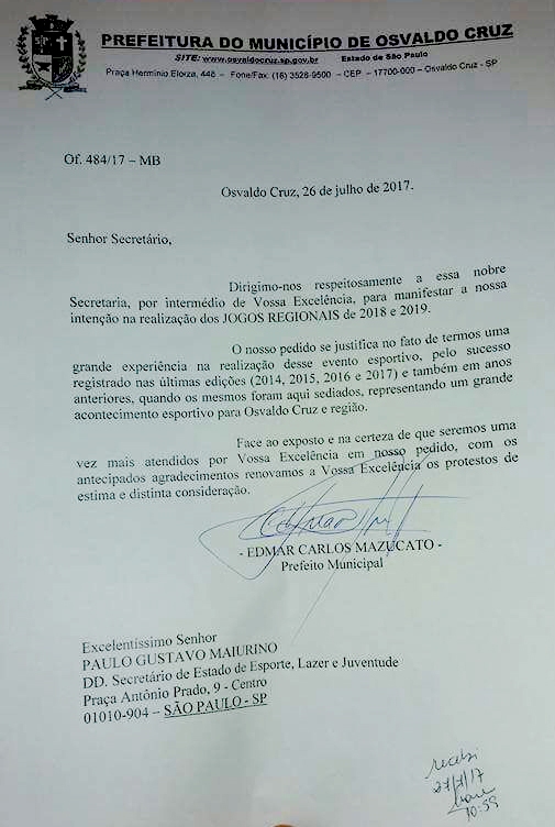 Adamantina reforça pedido para sediar Jogos Regionais em 2018, com audiência na Secretaria Estadual dos Esportes, Lazer e Juventude, realizada no começo de julho. Abaixo, pedido formalizado nesta semana pelo prefeito de Osvaldo Cruz.