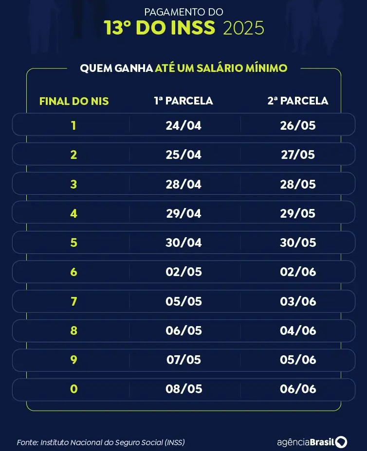 Cerca de 34,2 milhões de aposentados, pensionistas e beneficiários de auxílios do Instituto Nacional do Seguro Social (INSS) começam a receber nesta quinta-feira (24) a primeira parcela do décimo terceiro salário. Feito de forma escalonada, conforme o dígito final do Número de Inscrição Social (NIS), o pagamento vai até 8 de maio.