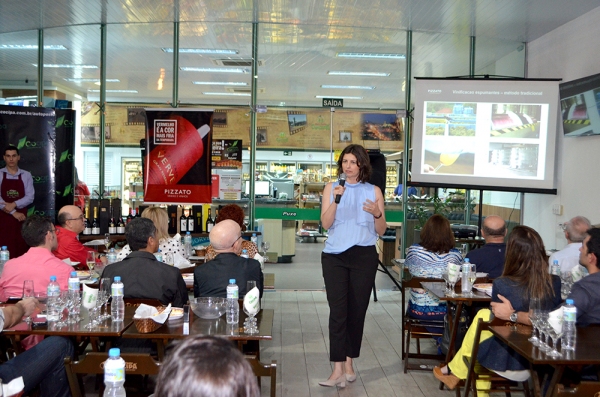 Jane Pizzato, diretora comercial da Pizzato Vinhas e Vinhos, fez uma ampla exposição sobre os vinhos e espumantes Pizzato e Fausto, detalhando um lote especial de sete rótulos produzidos na Serra Gaúcha, com informações sobre as uvas predominantes em cada formulação, as notas de degustação possíveis de serem identificadas em cada bebida e as sugestões de harmonização, entre pratos diversos, carnes, frios, queijos e outros acompanhamentos.