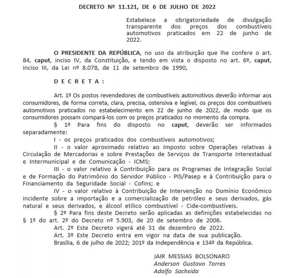 A partir desta quinta-feira (7), os postos de combustíveis de todo país estão obrigados a divulgar, de forma “correta, clara, precisa, ostensiva e legível”, os preços dos combustíveis que eram cobrados, em cada empresa, no dia 22 de junho de 2022, “de modo que os consumidores possam compará-los com os preços praticados no momento da compra”. A determinação, com vigência até 31 de dezembro de 2022, consta do decreto nº 11.121, publicado no Diário Oficial da União de hoje.