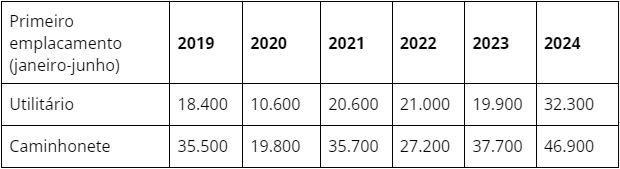 Destaque ainda, neste ano, para o desempenho de utilitários e caminhonetes. Ambos tiveram, de janeiro a junho, o maior número de primeiros emplacamentos dos últimos cinco anos. Na comparação com 2023, o volume de primeiras placas de caminhonete subiu 24,5%. Já os utilitários, veículos que podem ser usados tanto para o transporte de carga como de pessoas, para fins comerciais e pessoais, registraram um salto de 62%.