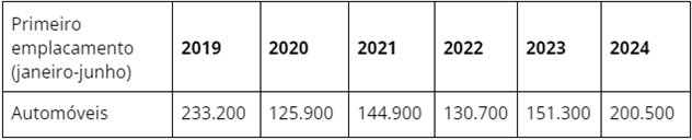Na tabela abaixo, num recorte dos últimos cinco anos, é possível ver como o volume de primeiras placas de automóveis contabilizado de janeiro a junho de 2024 é o que mais se aproxima do nível pré-pandemia. Mais do que isso, ele representa uma expansão de 32,5% sobre o mesmo período do ano passado. A persistir essa tendência, o patamar pré-pandemia pode ser batido em breve.