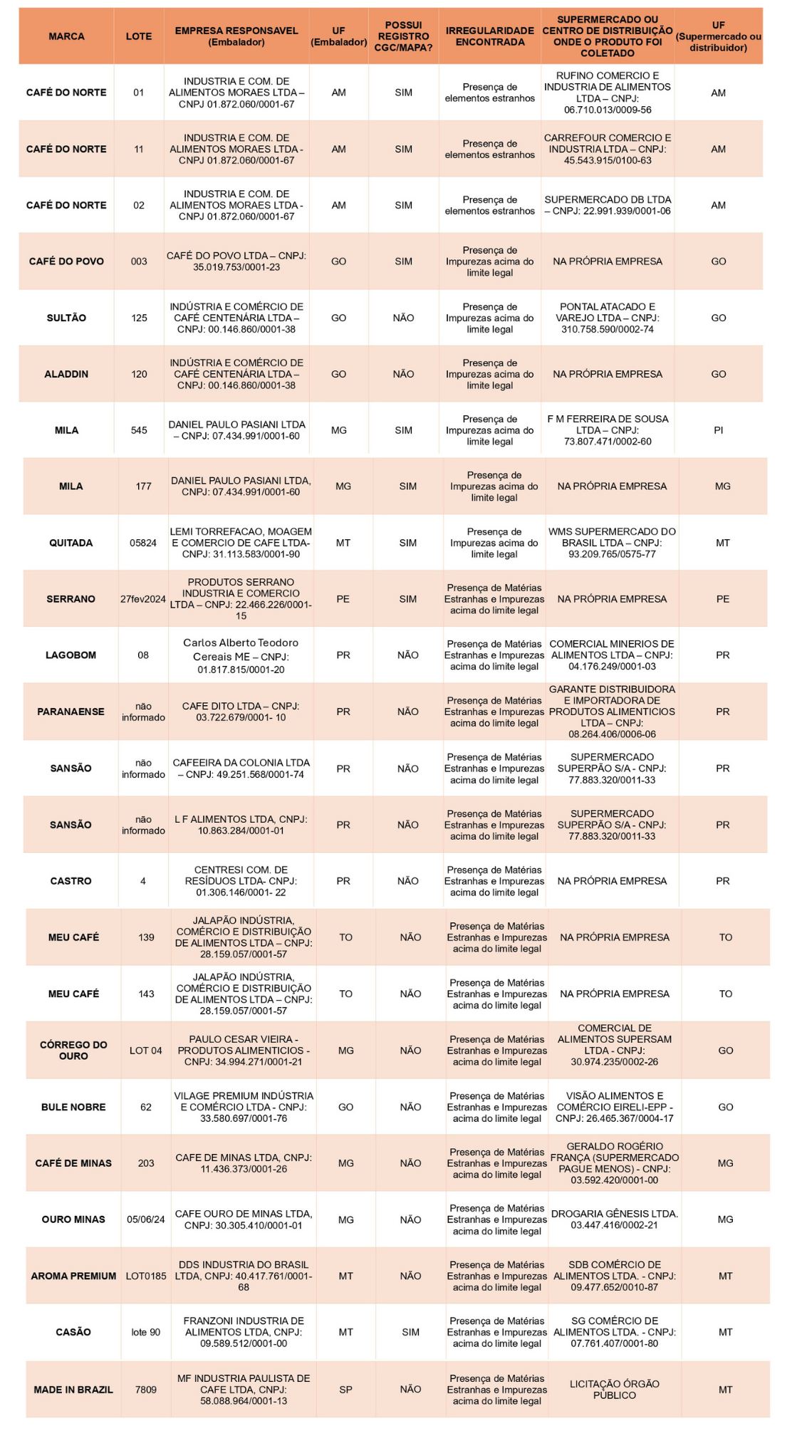 O Ministério da Agricultura e Pecuária divulgou nesta segunda-feira (1º) uma lista com 14 marcas de café torrado (quadro abaixo) que foram consideradas impróprias para consumo humano após a constatação de impurezas ou de elementos estranhos acima dos limites permitidos pela legislação.
