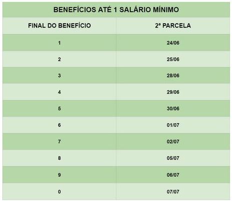 O Instituto Nacional do Seguro Social (INSS) iniciou nesta quinta-feira (24) o pagamento da segunda parcela do 13º salário de aposentados e pensionistas. Até 7 de julho, o instituto conclui o pagamento para cerca de 31 milhões de segurados. A data do depósito é de acordo com o número final do benefício (começa pelo 1), sem levar em conta o dígito verificador.