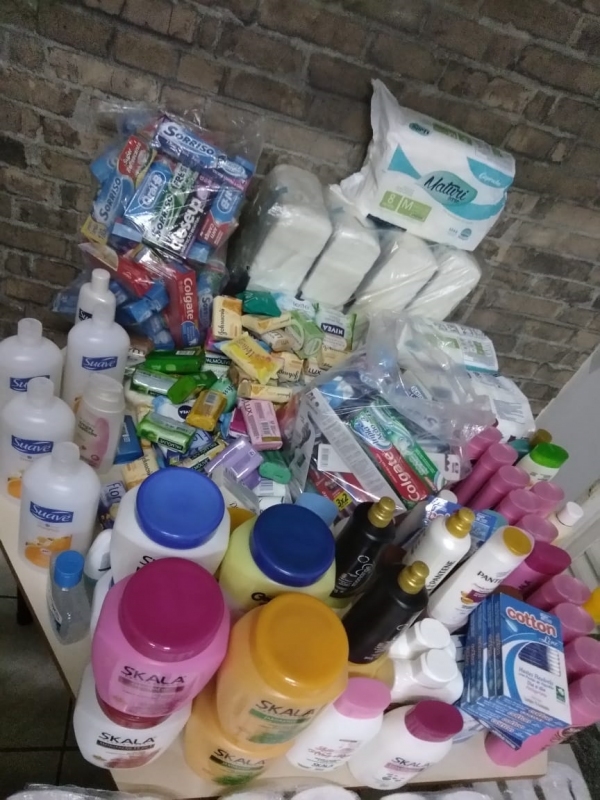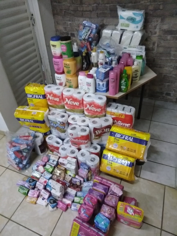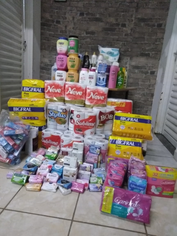 Entre os itens de higiene pessoal arrecadados 376 absorventes, 194 sabonetes, 8 pacotes de fralda, 13 caixas de cotonetes, 14 hidratantes, 104 rolos de papel higiênico, 45 escovas dentais, 100 cremes dentais, 10 rolos de papel toalha, 1 gel de cabelo, 5 cremes de pentear, 23 shampoos, 14 condicionadores, 1 desodorante e 1 sabonete íntimo. Já entre os materiais de limpeza foram arrecadados 3 detergentes e 1 pacote de sabão em barra. Entre os alimentos, foram arrecadados 1 achocolatado, 17 kg de arroz, 3 kg de feijão, 4 kg de açúcar, 6 pacotes de macarrão, 1 kg de farinha, 3 litros de óleo e 5 extratos de tomate.