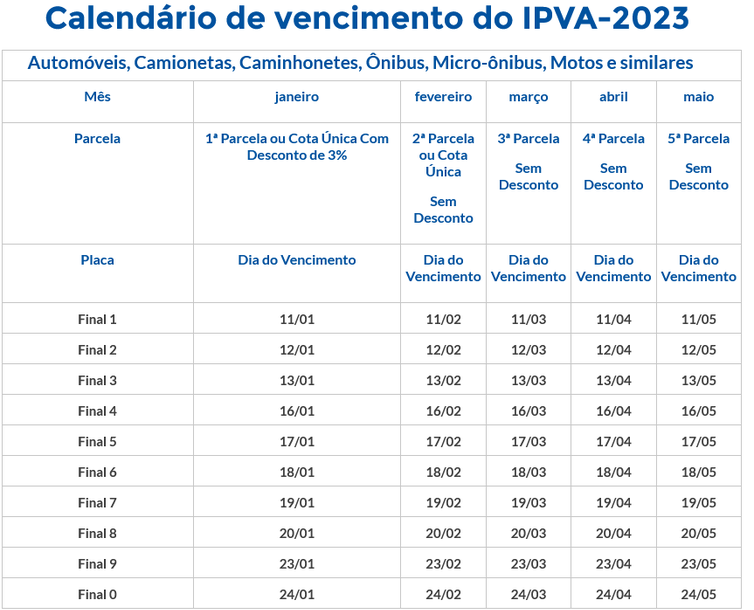 - Em 5 vezes, de janeiro a maio (IPVA acima de R$ 342,60).