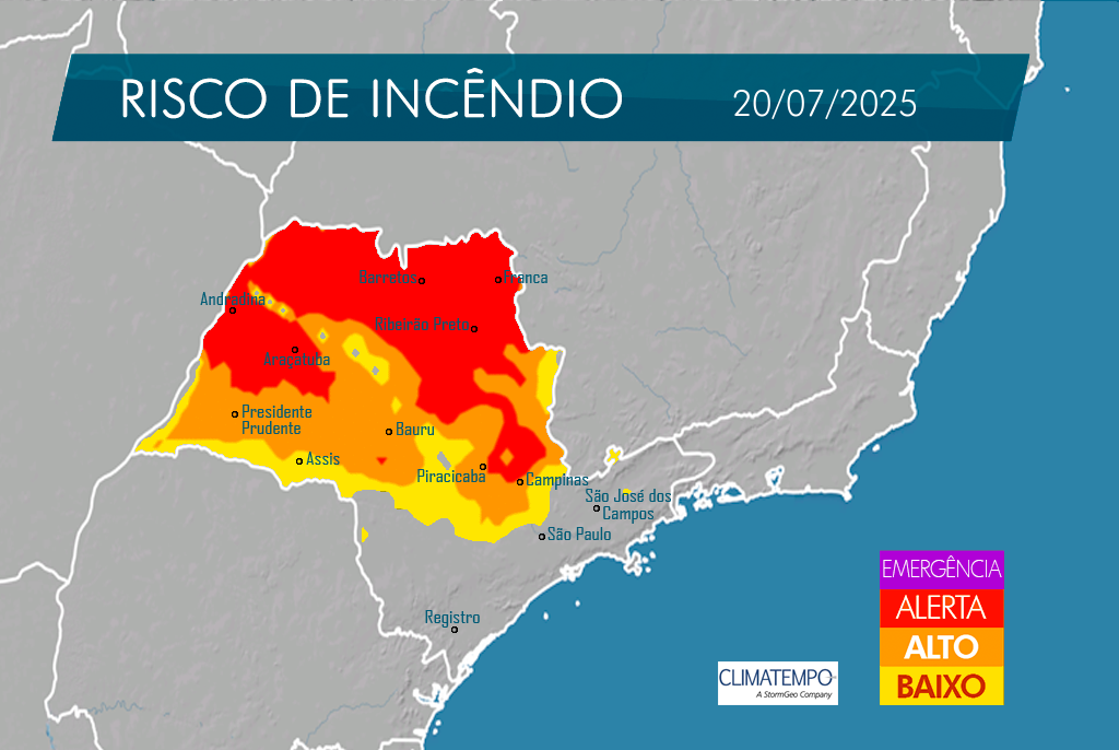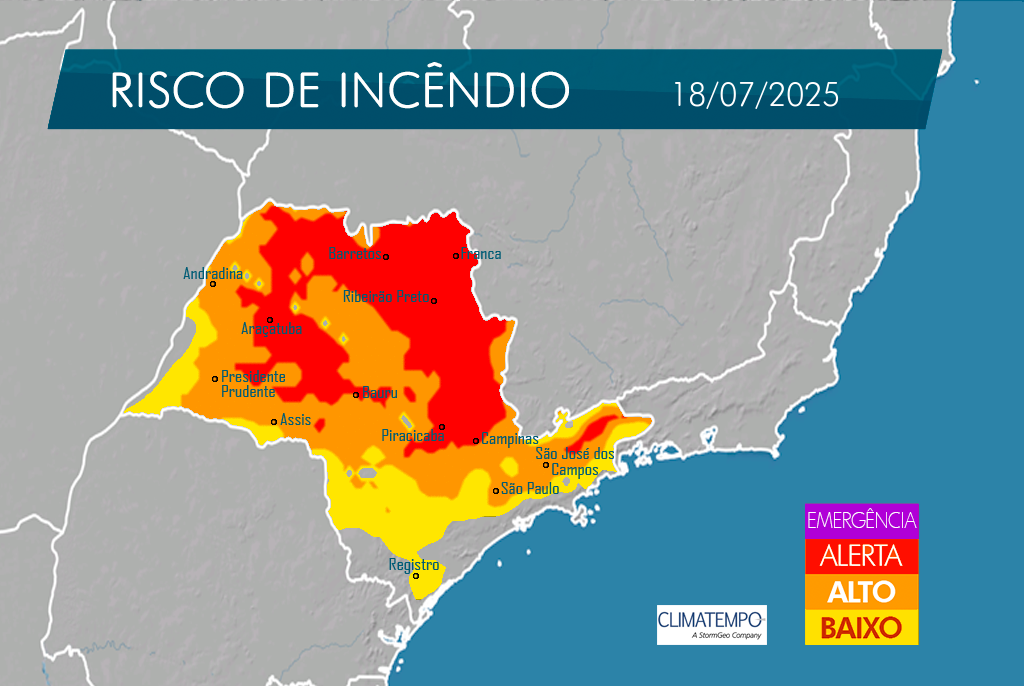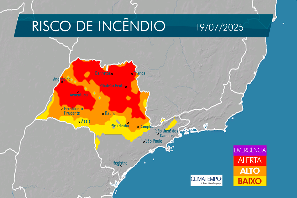 Nos próximos dias, quase todo o estado de São Paulo estará em estado de atenção para incêndios. O risco é elevado principalmente na quinta (17) e na sexta-feira (18), quando a baixa umidade relativa do ar, as temperaturas elevadas e o predomínio do Sol intensificam as chances de queimadas em todas as regiões paulistas.