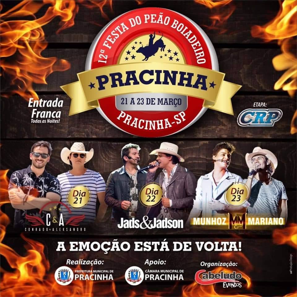 A 12ª Festa do Peão Boiadeiro de Pracinha é uma realização da Prefeitura Municipal com apoio da Câmara Municipal e organização da Cabeludo Eventos.