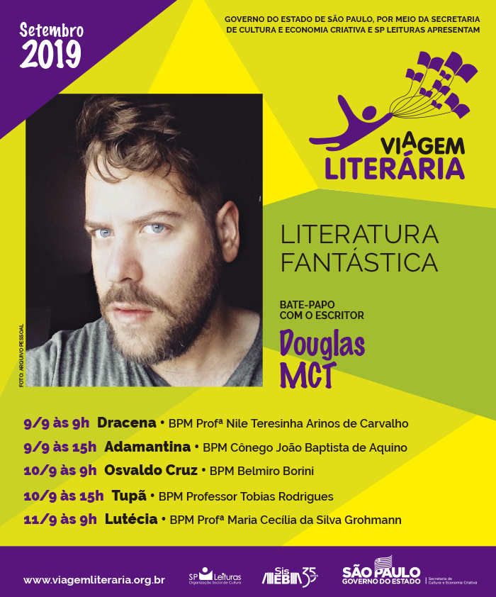A Secretaria de Cultura e Economia Criativa do Estado por meio do Sistema Estadual de Bibliotecas Públicas de São Paulo (SisEB) e realizado pela SP Leituras – Associação Paulista de Bibliotecas e Leitura, em parceria com a Secretaria de Cultura e Turismo de Adamantina, realiza na próxima semana mais um módulo do Programa Viagem Literária – Literatura Fantástica na cidade. Dessa vez, a programação será um bate-papo com escritor convidado Doulgas MCT.