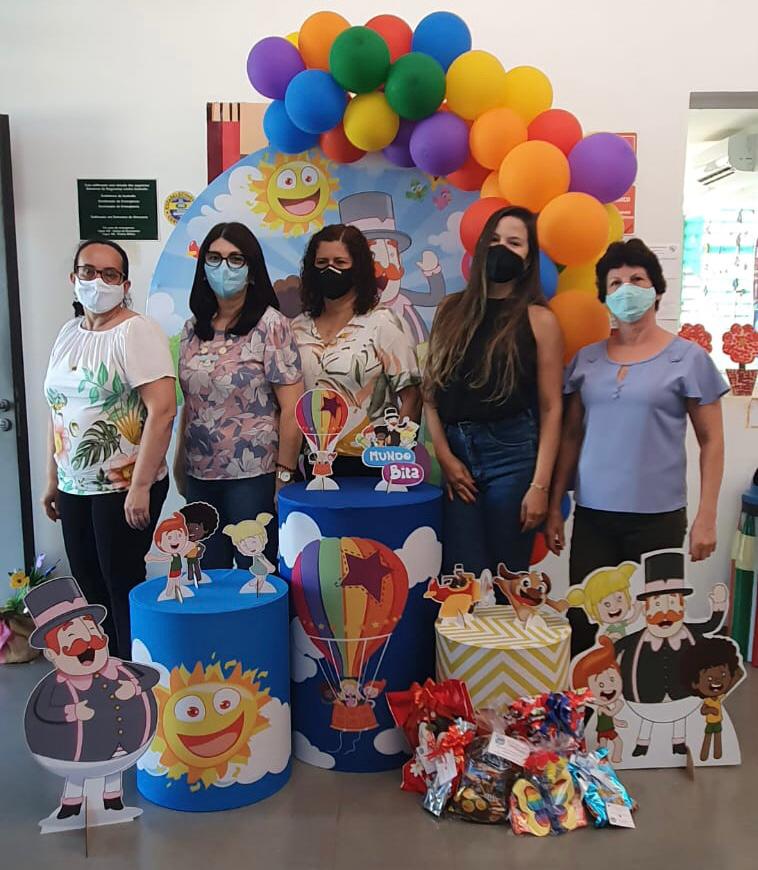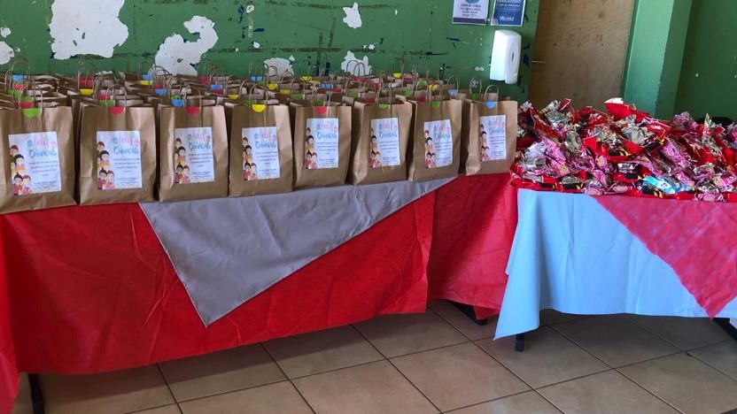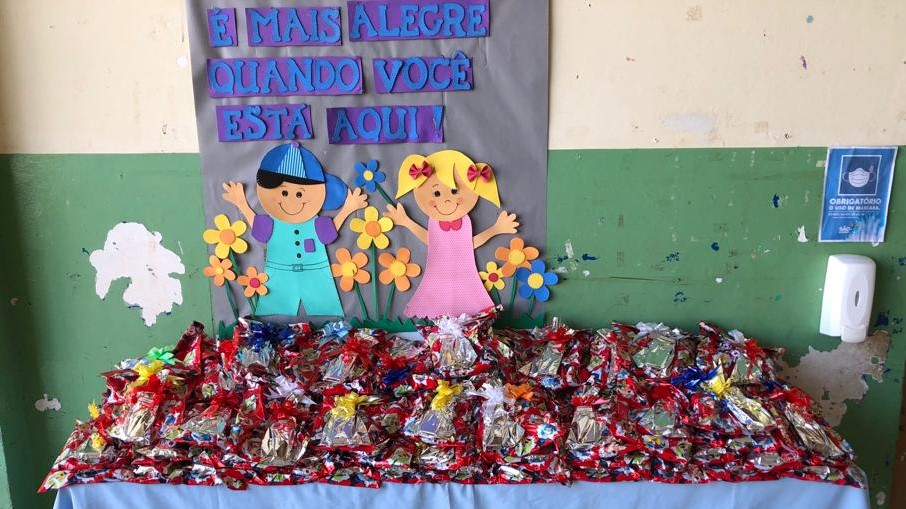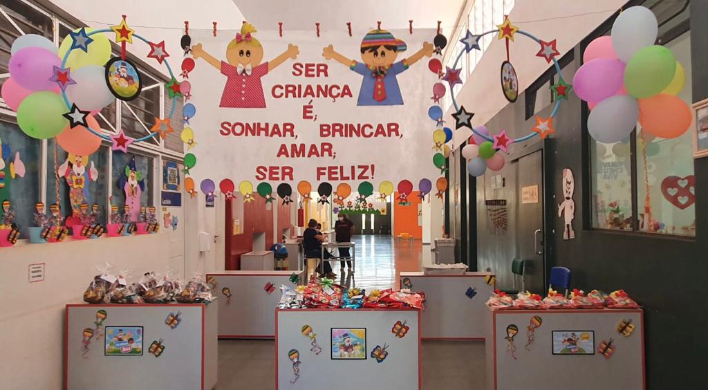 Os espaços das escolas foram preparados dentro de um ambiente de celebração à data, para a entrega dos kits de presentes, o que permitiu a melhor organização e a observância ao distanciamento social.