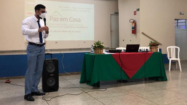 Já à noite, também no mesmo espaço, ocorreu a palestra presencial "A Justiça no Universo Escolar", com o promotor de justiça da 3ª Promotoria de Justiça da Comarca de Adamantina, Marlon Roberth de Sales, também dirigida a professores da rede de ensino do município.
